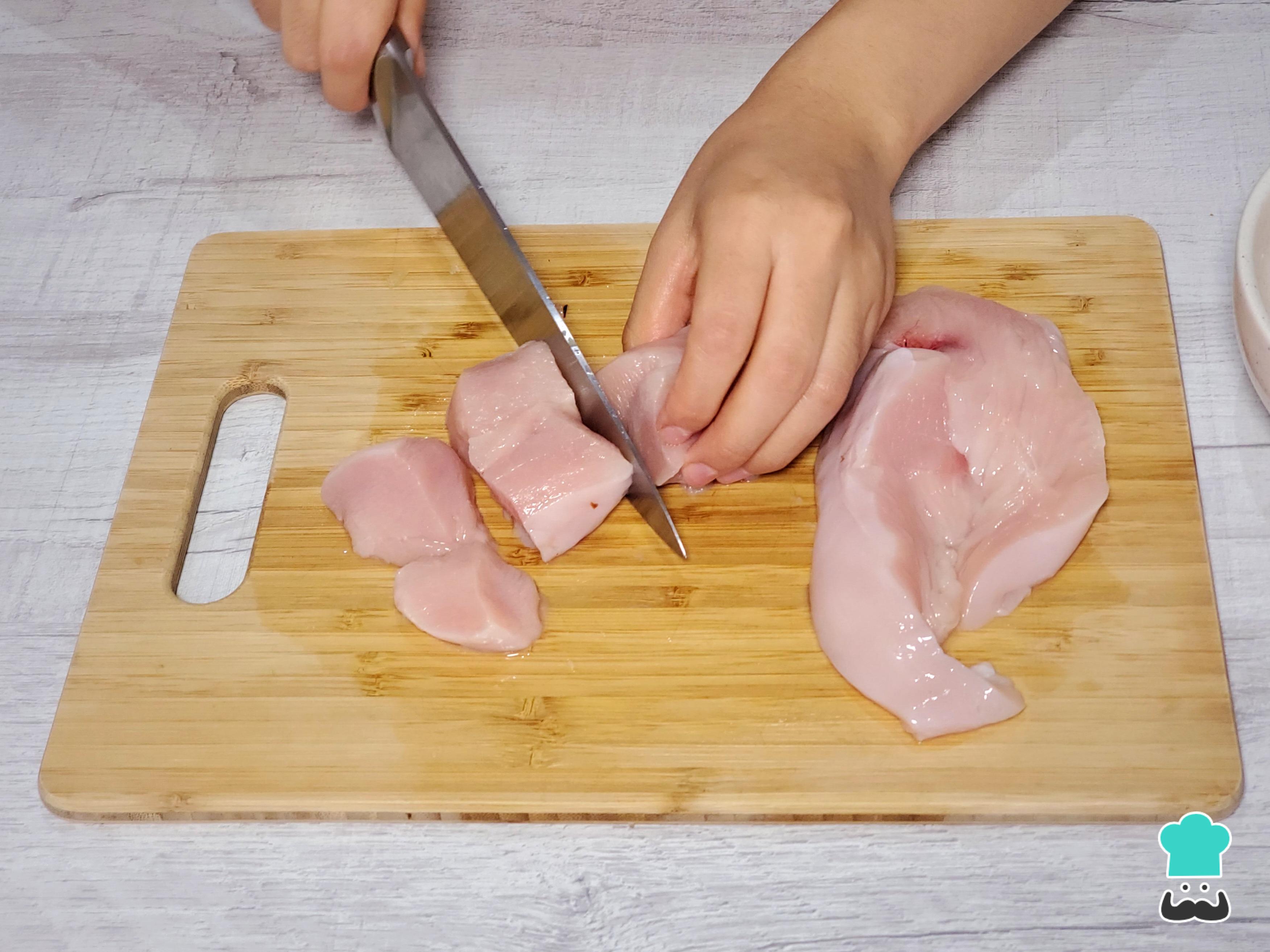 Para empezar a preparar esta receta, corta la pechuga de pollo en cubos uniformes. Retira las pechugas de la carcasa si las compraste enteras. Luego, corta cada pechuga en tiras gruesas de aproximadamente dos dedos de grosor y, finalmente, corta de forma transversal para obtener cubos de tamaño similar.