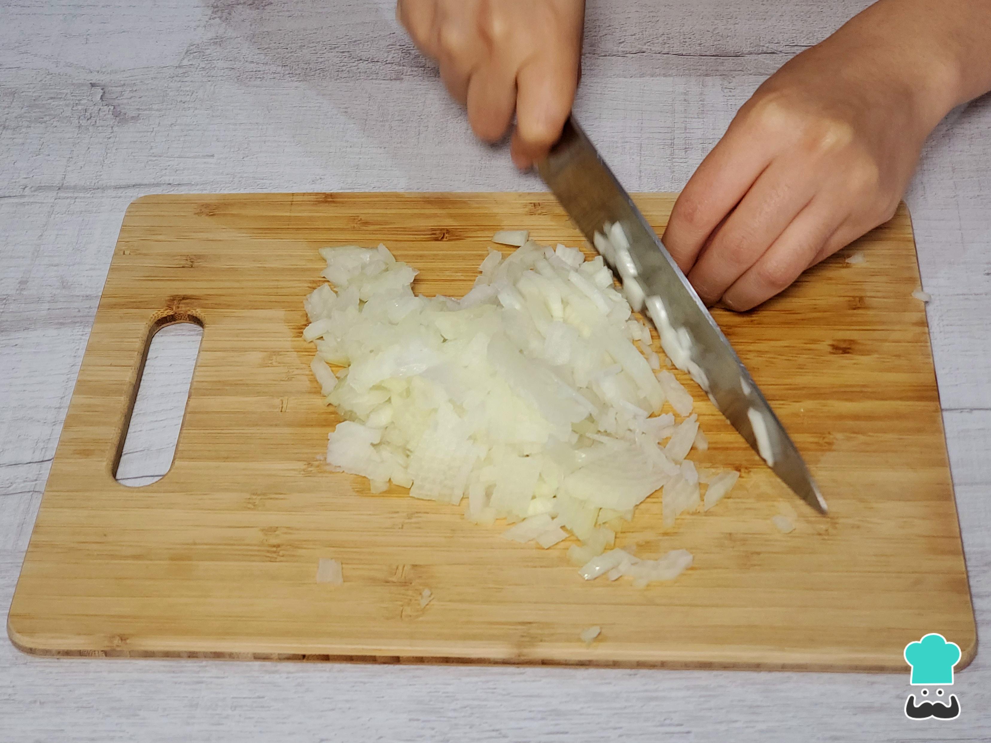 Corta una cebolla finamente. Para un sabor más intenso y auténtico, usa la parte blanca de la cebolla china o cebollín. Si no lo consigues, la cebolla blanca común también funciona perfectamente.