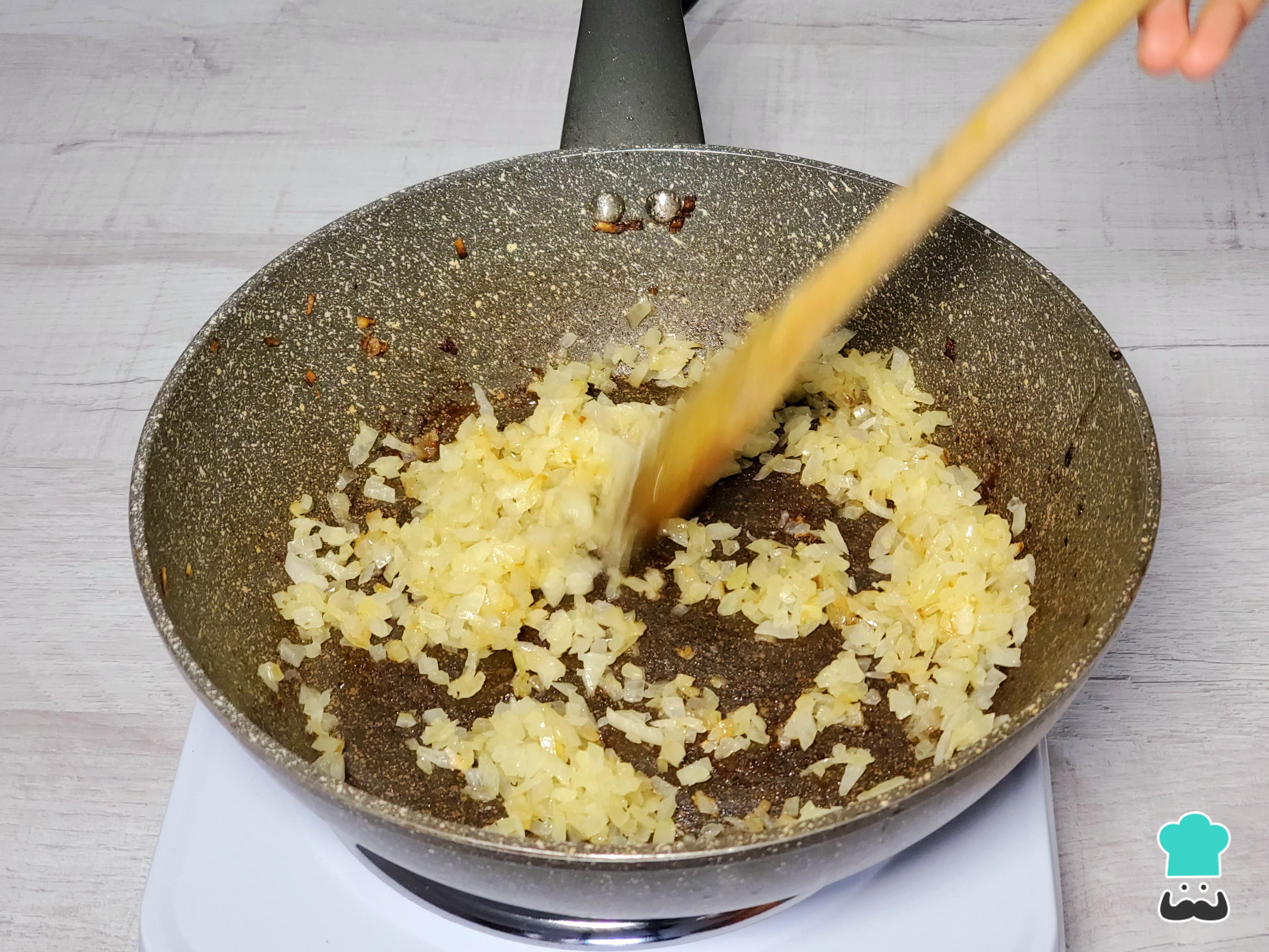 En la misma sartén, vierte otro chorro de aceite y agrega la cebolla picada, removiendo bien para sudarla hasta que esté transparente. Incorpora el ajo finamente picado y el jengibre rallado o en láminas, cocinando hasta que liberen su aroma característico.