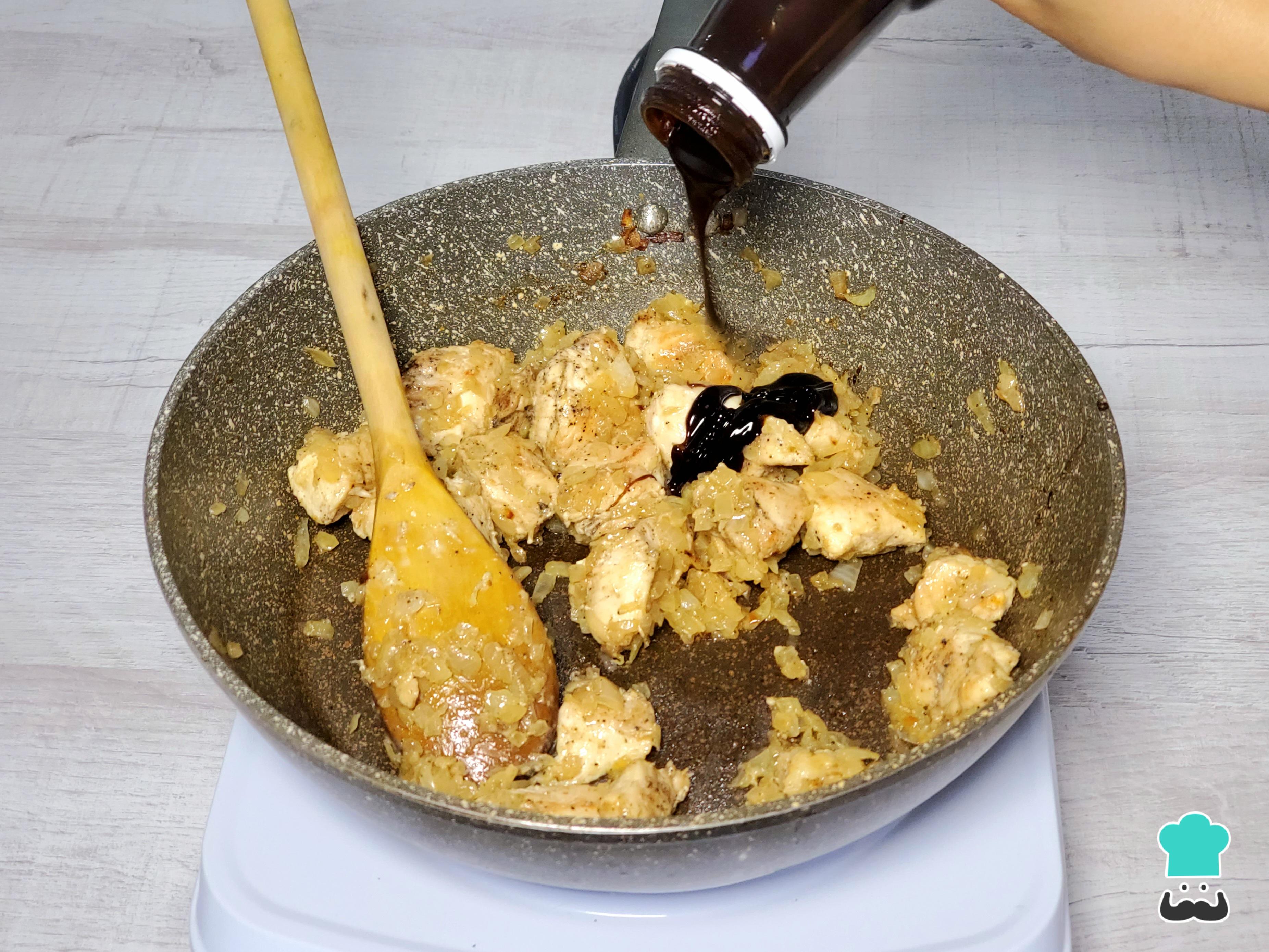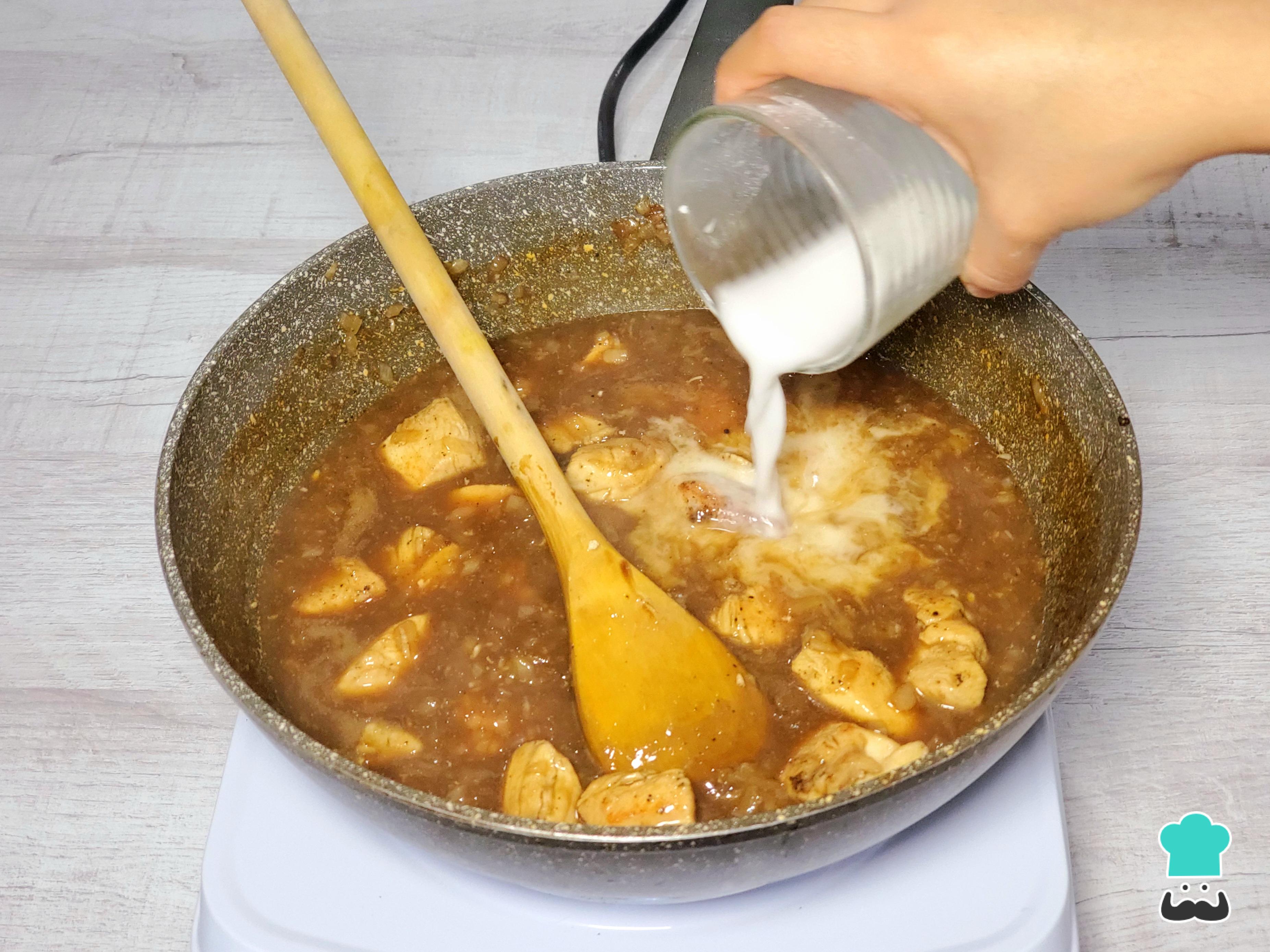 Añade los cubos de pollo sellado y cubre con el caldo de pollo y la salsa a la soja. Remueve bien para integrar todos los sabores y deja hervir un par de minutos para que el pollo termine de cocinarse completamente.
