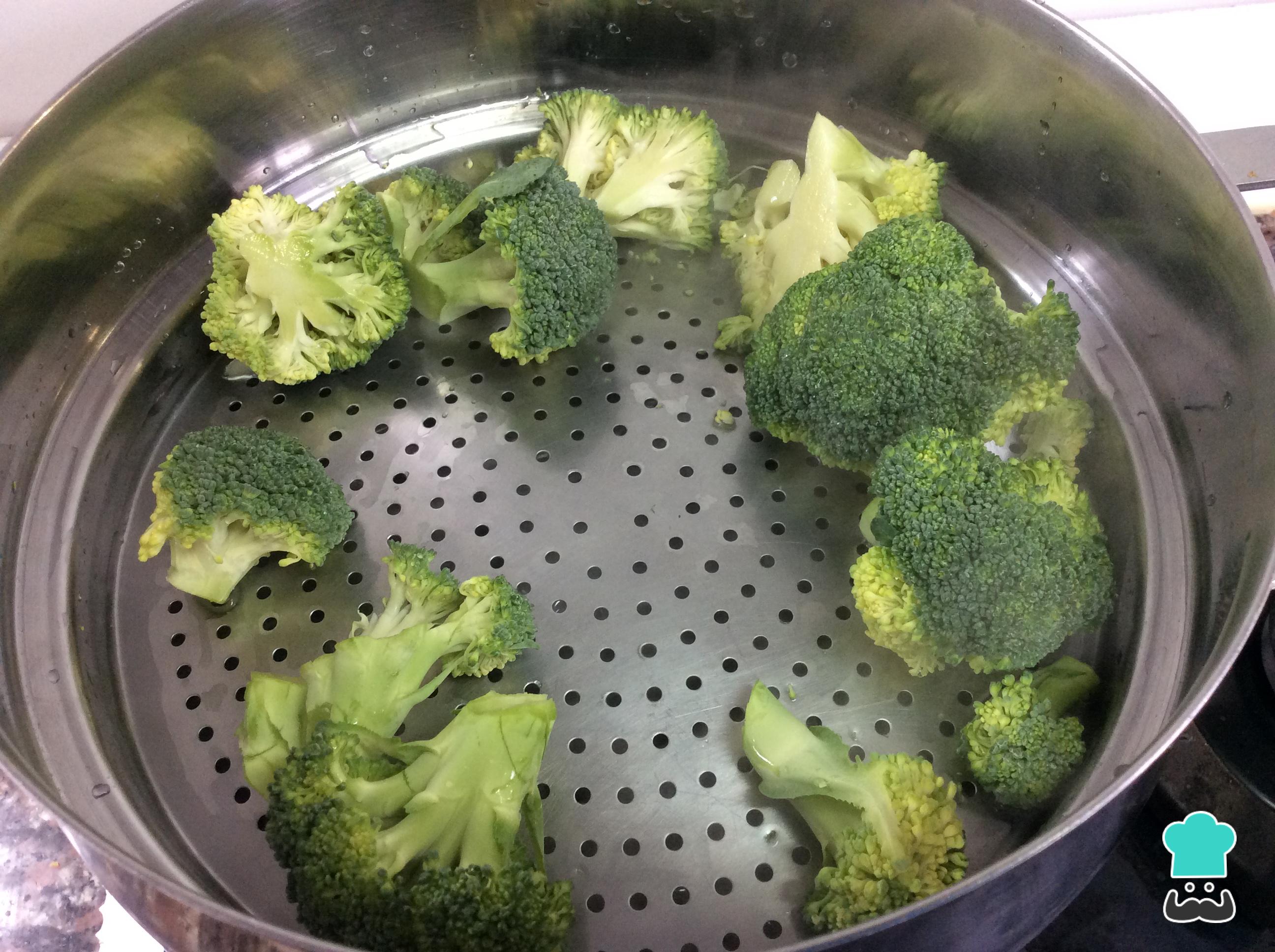 Como ya tenemos el pollo cocinado, nos encargamos primero del brócoli. Lo troceamos, lo lavamos y lo colocamos en una vaporera para cocinarlo al vapor, de tal forma que nos quedará muy sano. Con 10 minutos será suficiente, el mismo tiempo que necesitamos para preparar la bechamel que servirá de salsa del pollo cremoso.