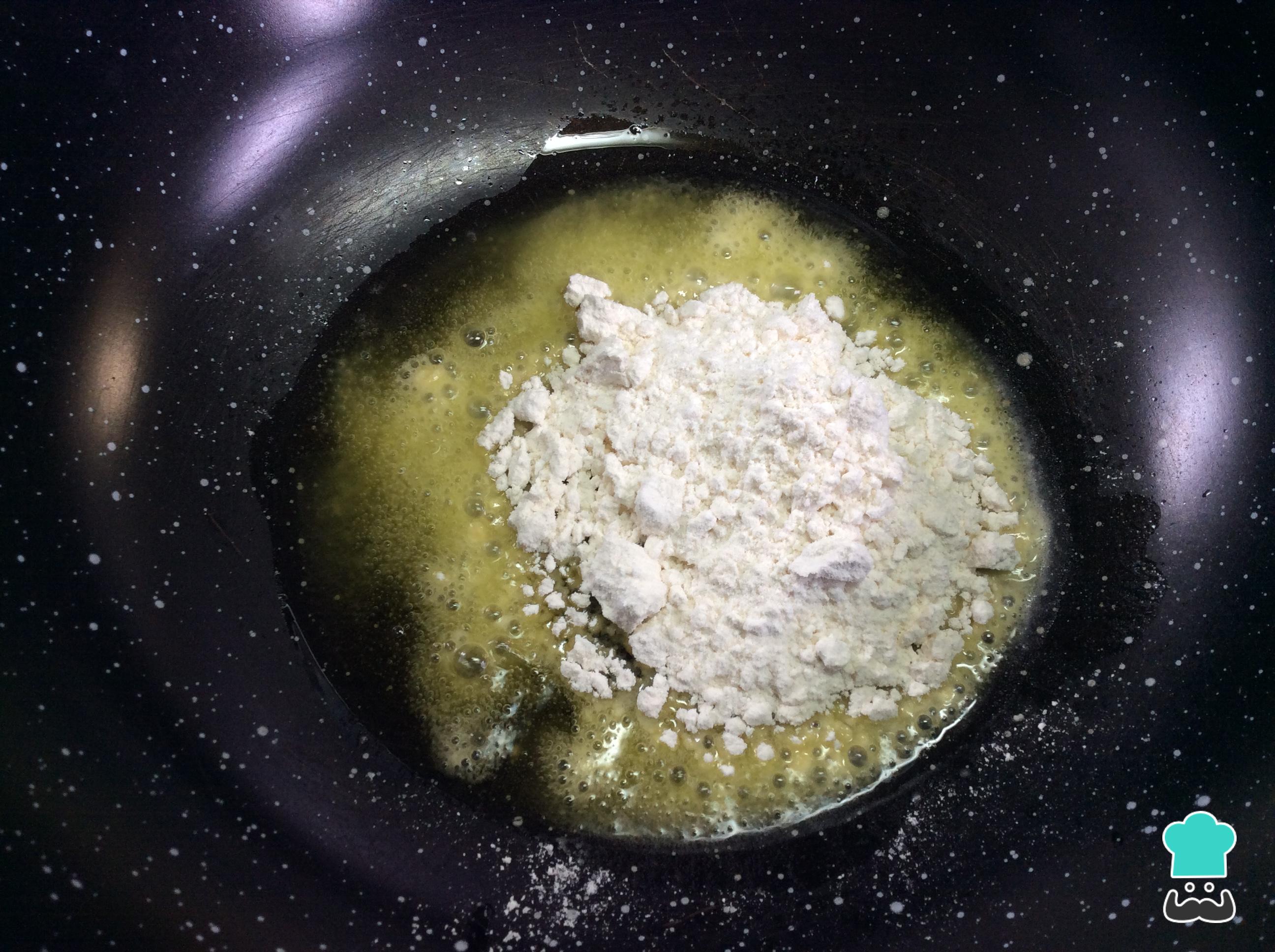 Preparamos la bechamel con aceite en lugar de mantequilla (es una opción, la puedes hacer como gustes). Calentamos el aceite y vertemos la harina, removiendo bien para evitar que se formen grumos.