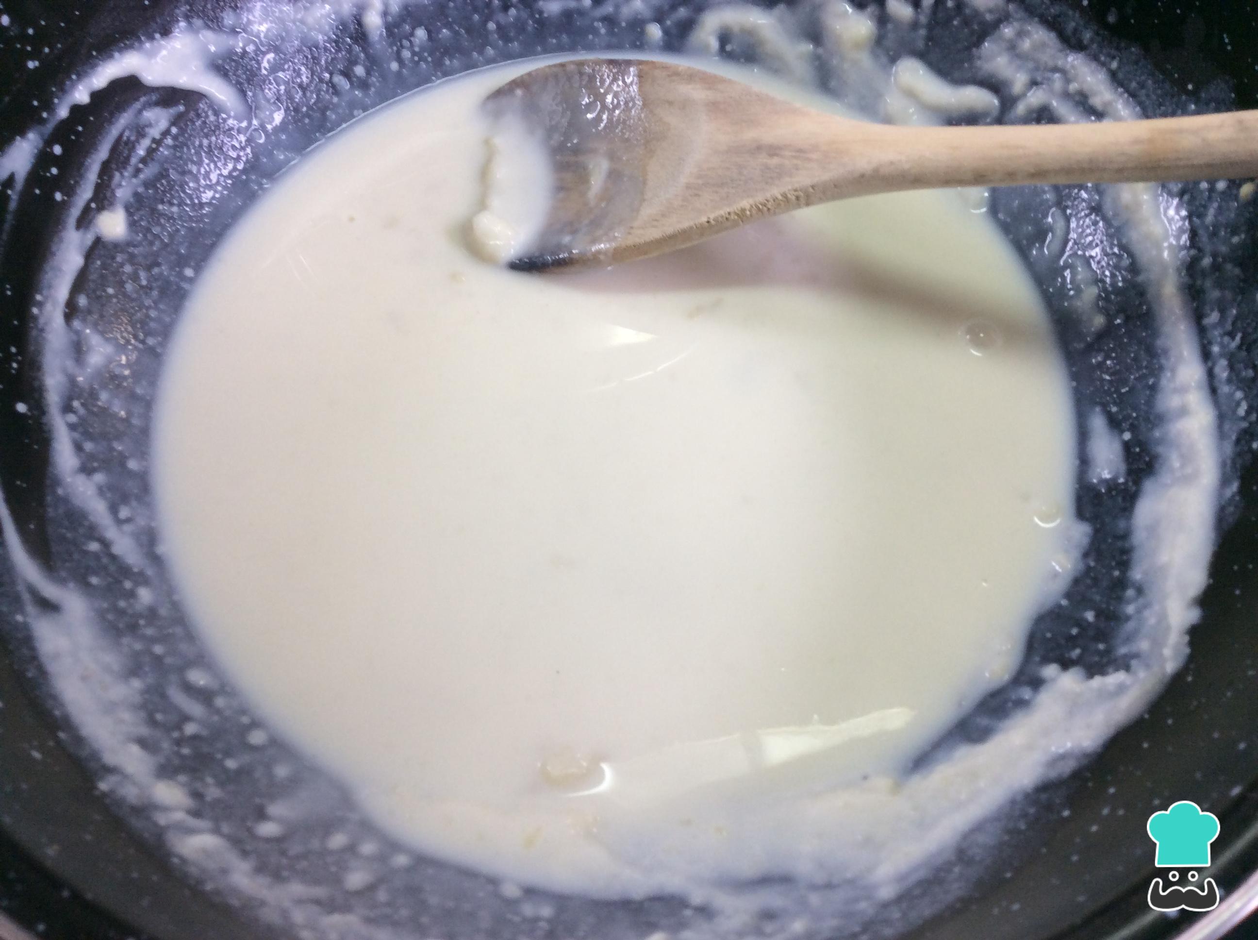A continuación vamos vertiendo la leche, removiendo al mismo tiempo sin parar, de tal forma que formemos una crema uniforme, que irá espesando a medida que se caliente.