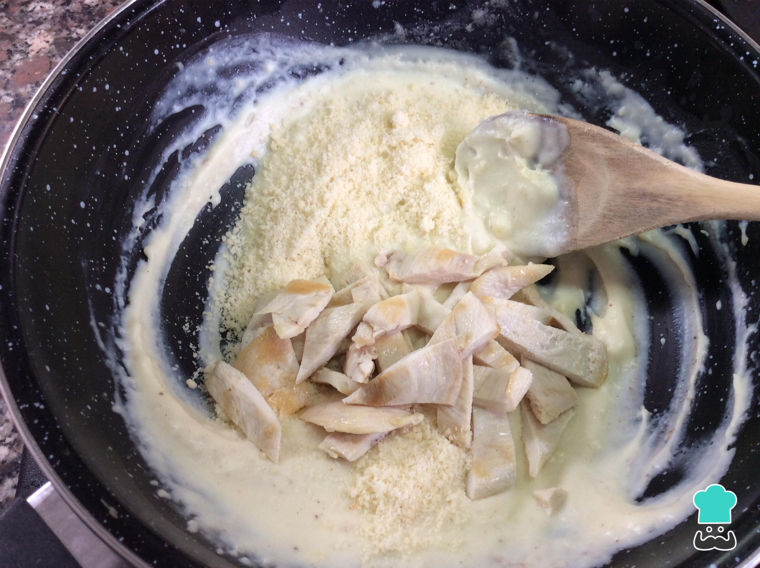 Cuando tengamos la bechamel lista, apagamos el fuego y añadimos sal, nuez moscada, el pollo cortado en tiras y el queso rallado (yo le he puesto parmesano). Y removemos bien... Es el momento también de apagar el fuego de la vaporera, donde tenemos el brócoli, que ya estará listo.