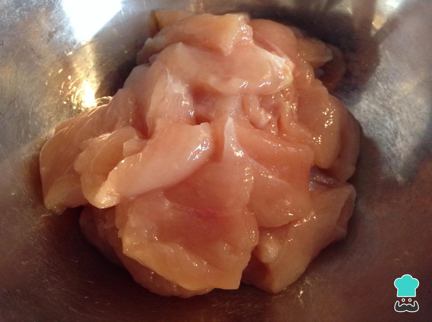 Corta la pechuga deshuesada en cubos de un bocado y llévalos a un bol.
