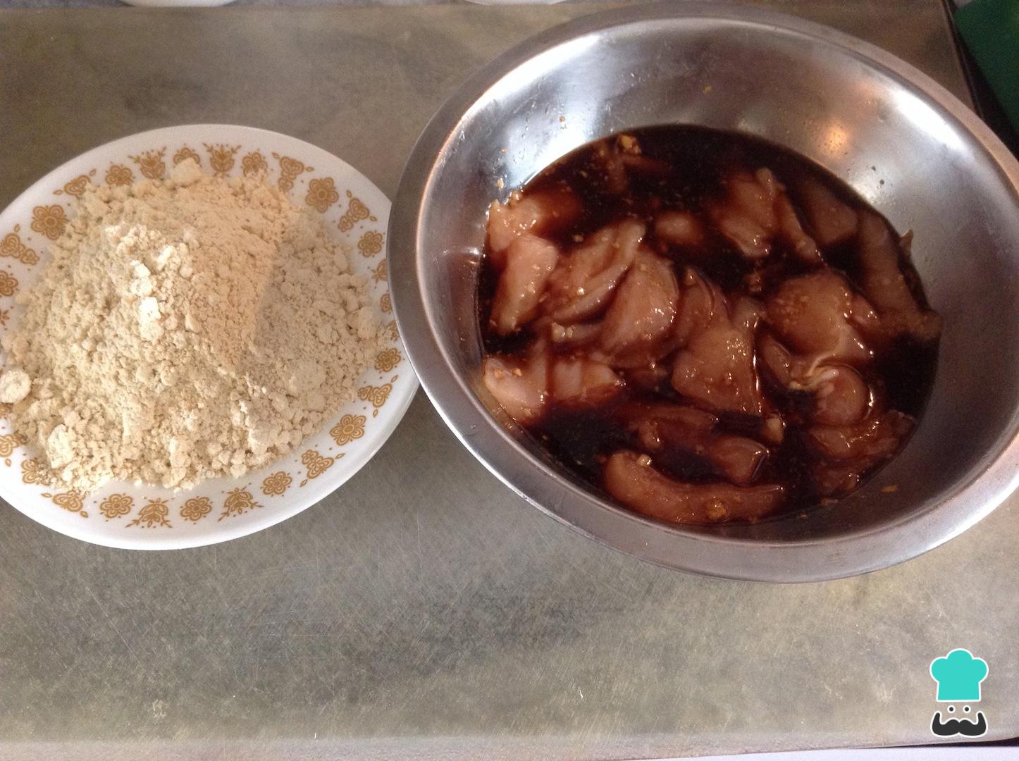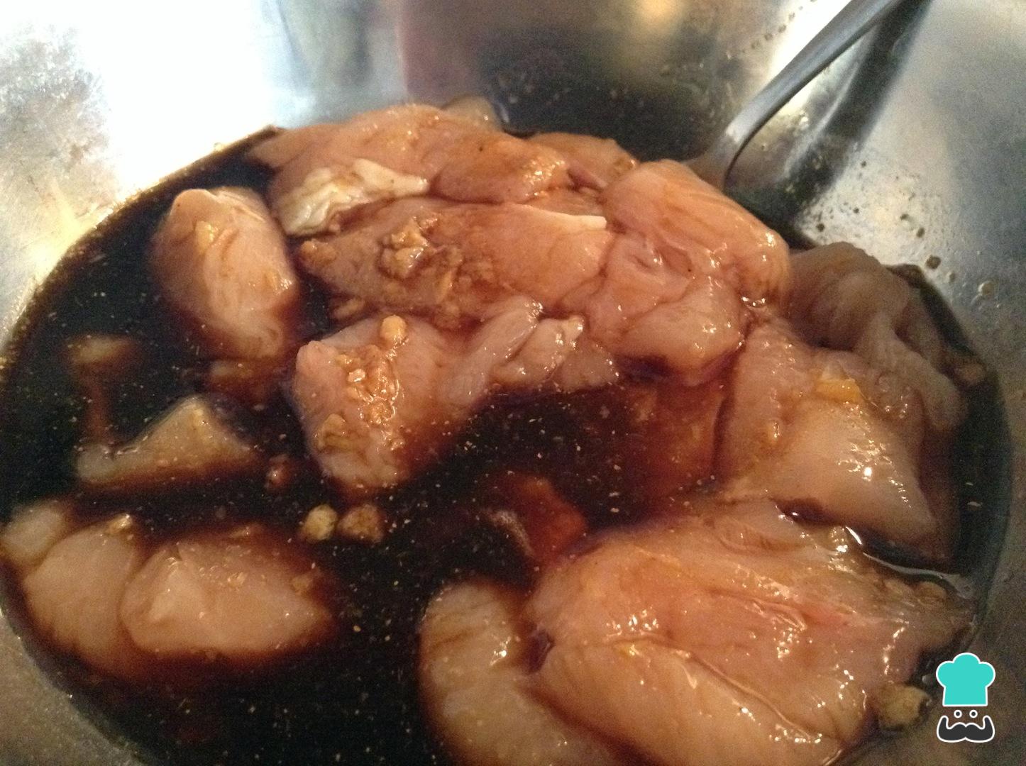 Añade la mezcla anterior al bol donde tenemos los trozos de pollo y deja marinar durante una hora, aproximadamente, en el refrigerador (cuanto más tiempo de marinado, mayor será el sabor del pollo).