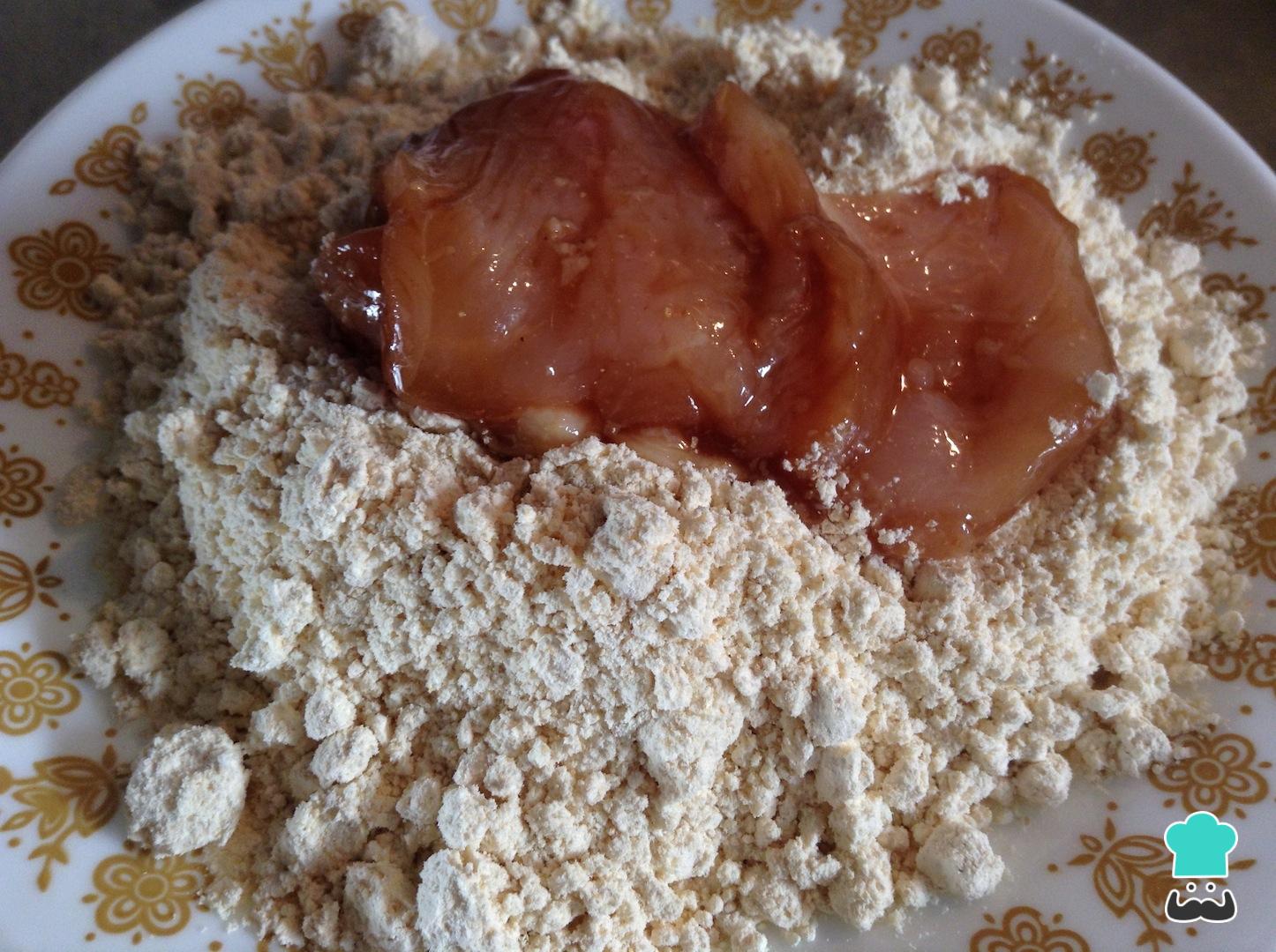 Pasamos los trozos de pollo primero por la harina de garbanzos para rebozarlos bien (si deseas puedes añadir un poco de sal y pimienta a la harina).