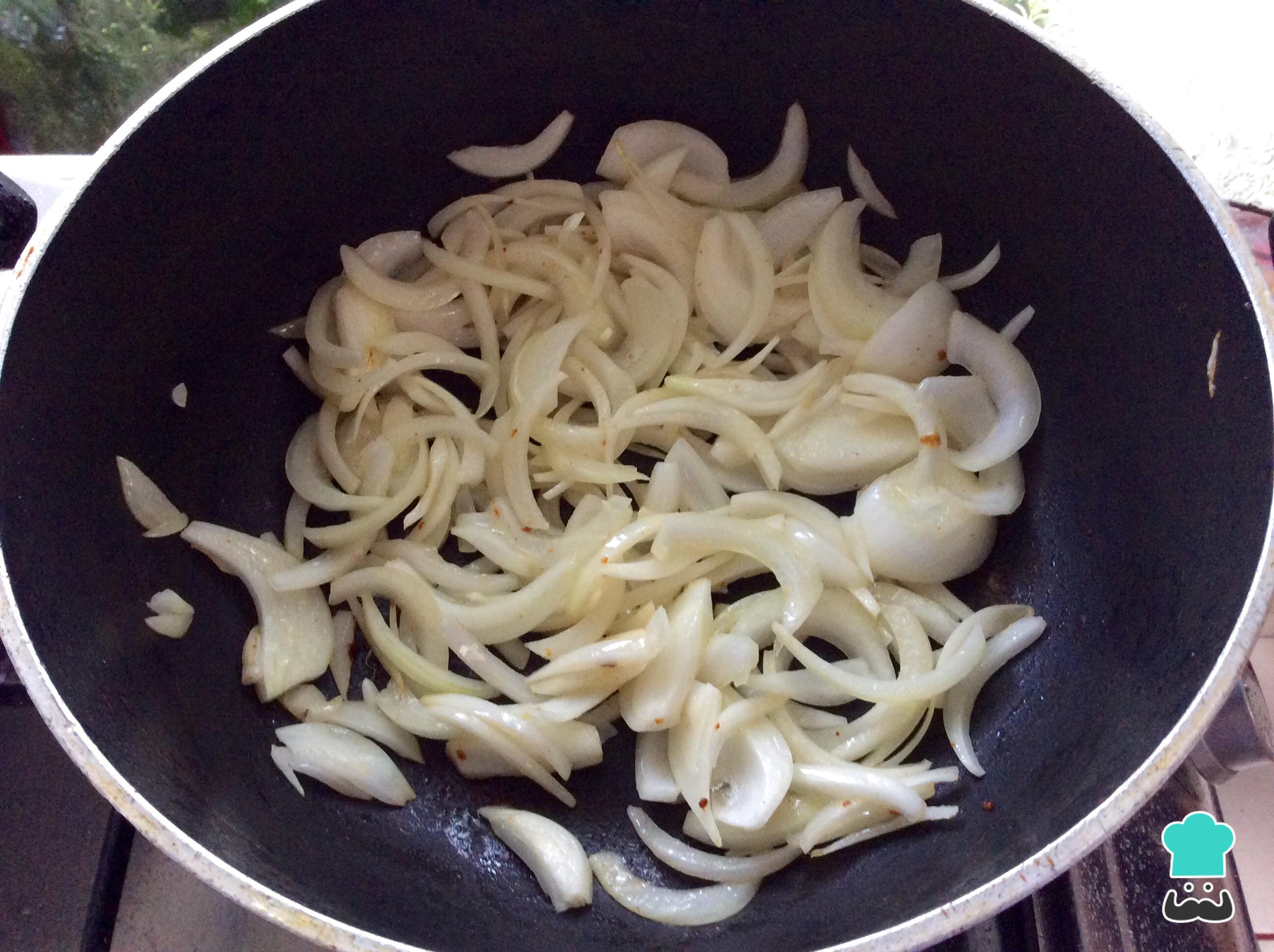 En la misma olla saltea la cebolla cortada en plumas o en tiras delgadas durante 4 minutos.