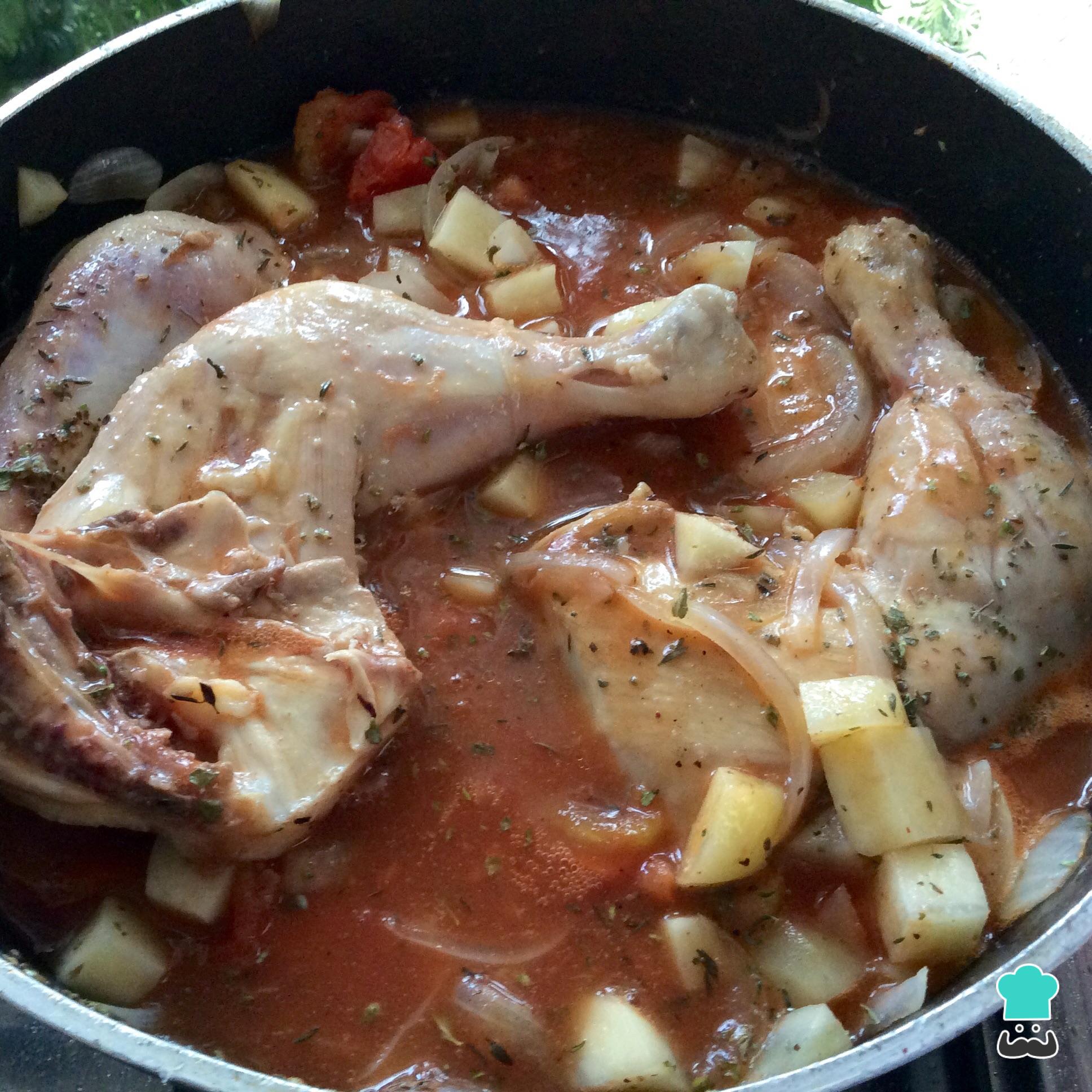 Pasados 5 minutos de cocción, agrega el pollo junto con las papas peladas y cortadas en cuadros. Añade también 2 cucharadas de pasta de tomate y el agua. Tapa el guiso de pollo y cocina a fuego bajo durante una hora.