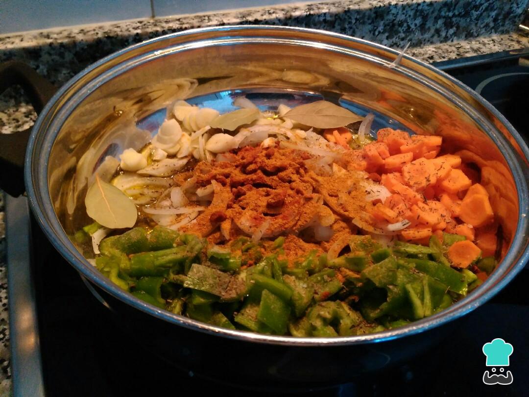 Seguidamente echamos las verduras a la cacerola junto con la pechuga previamente troceada y salpimentada. Sazonamos el sofrito base de nuestro guiso de pollo con sal, pimentón dulce y curry.