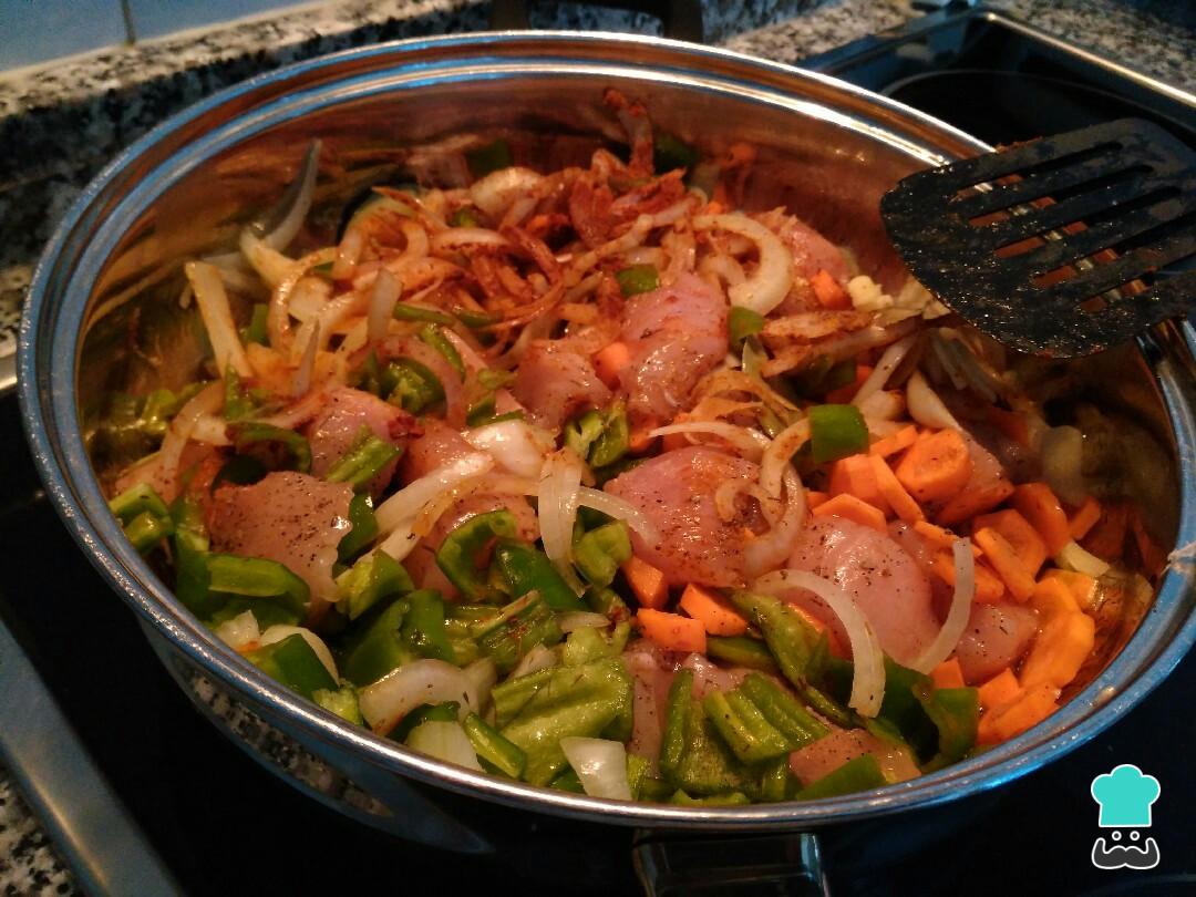Seguidamente lo mezclamos todo bien y dejamos sofreír el conjunto con por unos 10 minutos a fuego medio alto.