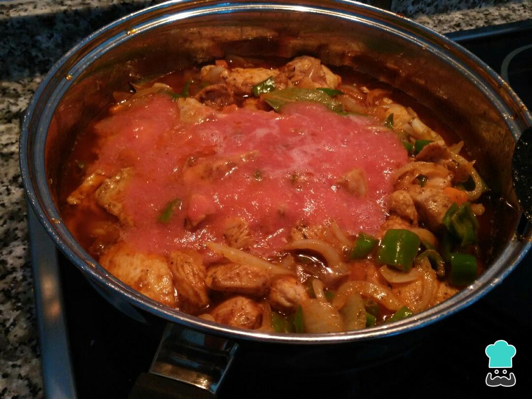 Pasado este tiempo y comprobando que el pollo se se vea sellado, incorporamos el tomate triturado.