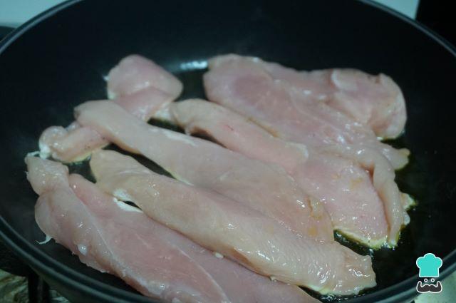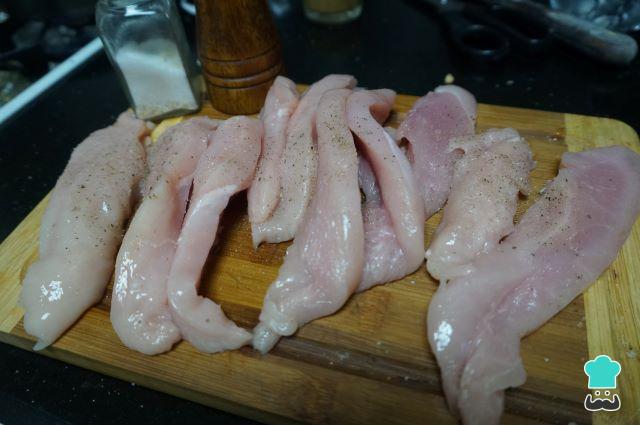Para empezar con la receta keto, primero empieza cortando el pollo en tiras. Seguido, añade un poco de sal y pimienta.
