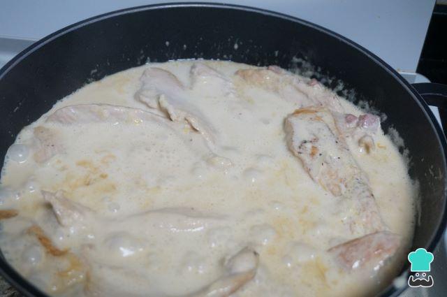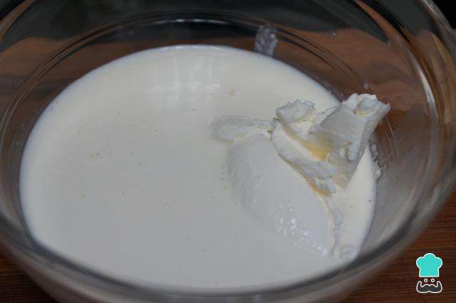 Mientras se dora el pollo, en un bol añade la nata y el queso crema, bate hasta que se quede mezclado.