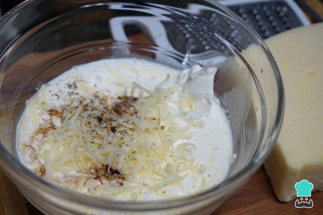 En el bol con la crema añade el queso rallado y la salsa de soja, mezcla todo bien. Si te gusta alguna especia más, puedes añadirla. Incluso, puedes añadir quesos variados para proporcionar más sabor.