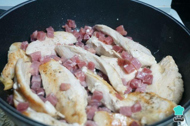 Cuando tengas el pollo guisado keto, baja un poco el fuego y añade los taquitos de jamón o de beicon, deja unos minutos para que se mezclen los sabores.