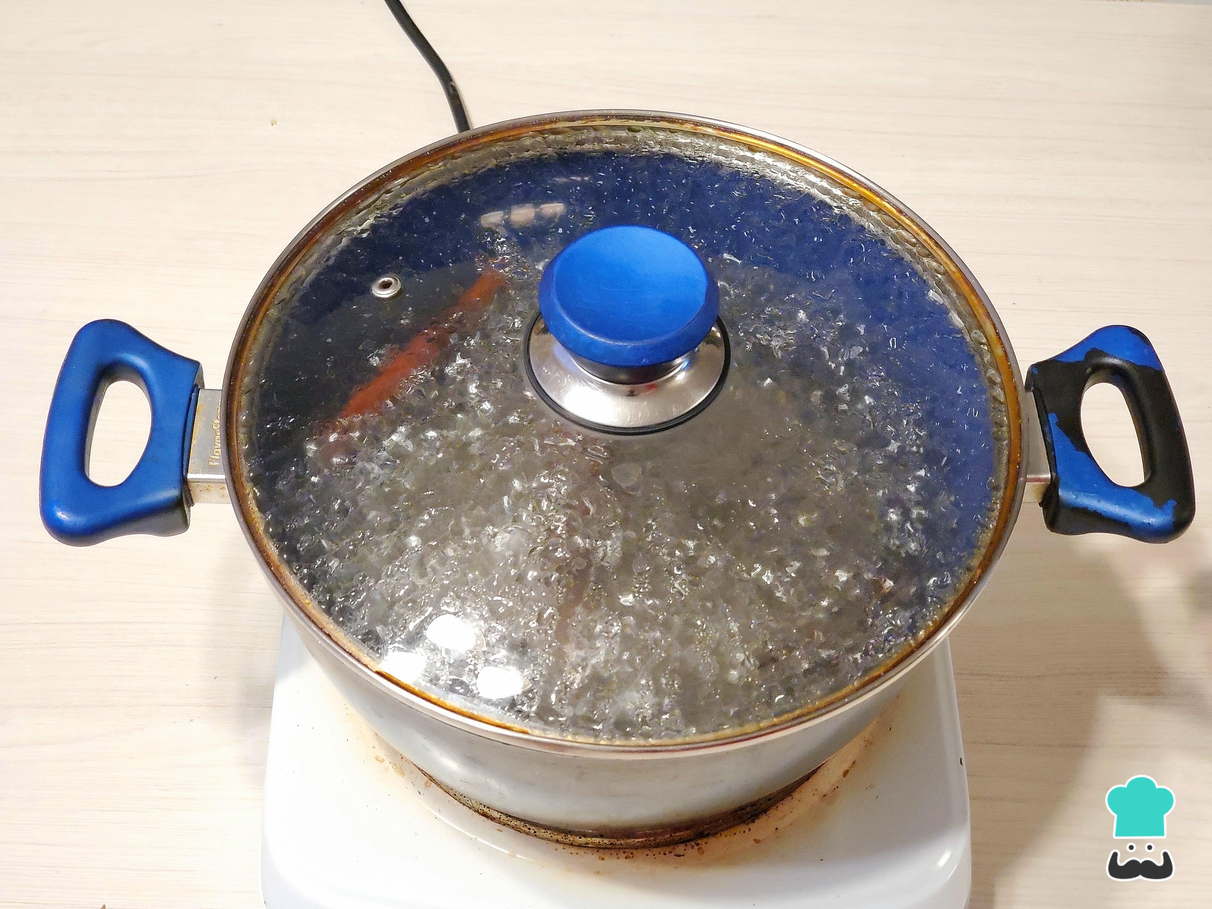 Empieza poniendo a hervir en una olla grande el agua junto con unas ramas de canela y los clavos de olor para aromatizar. Tapa la olla y deja que hierva por lo menos 5 minutos.