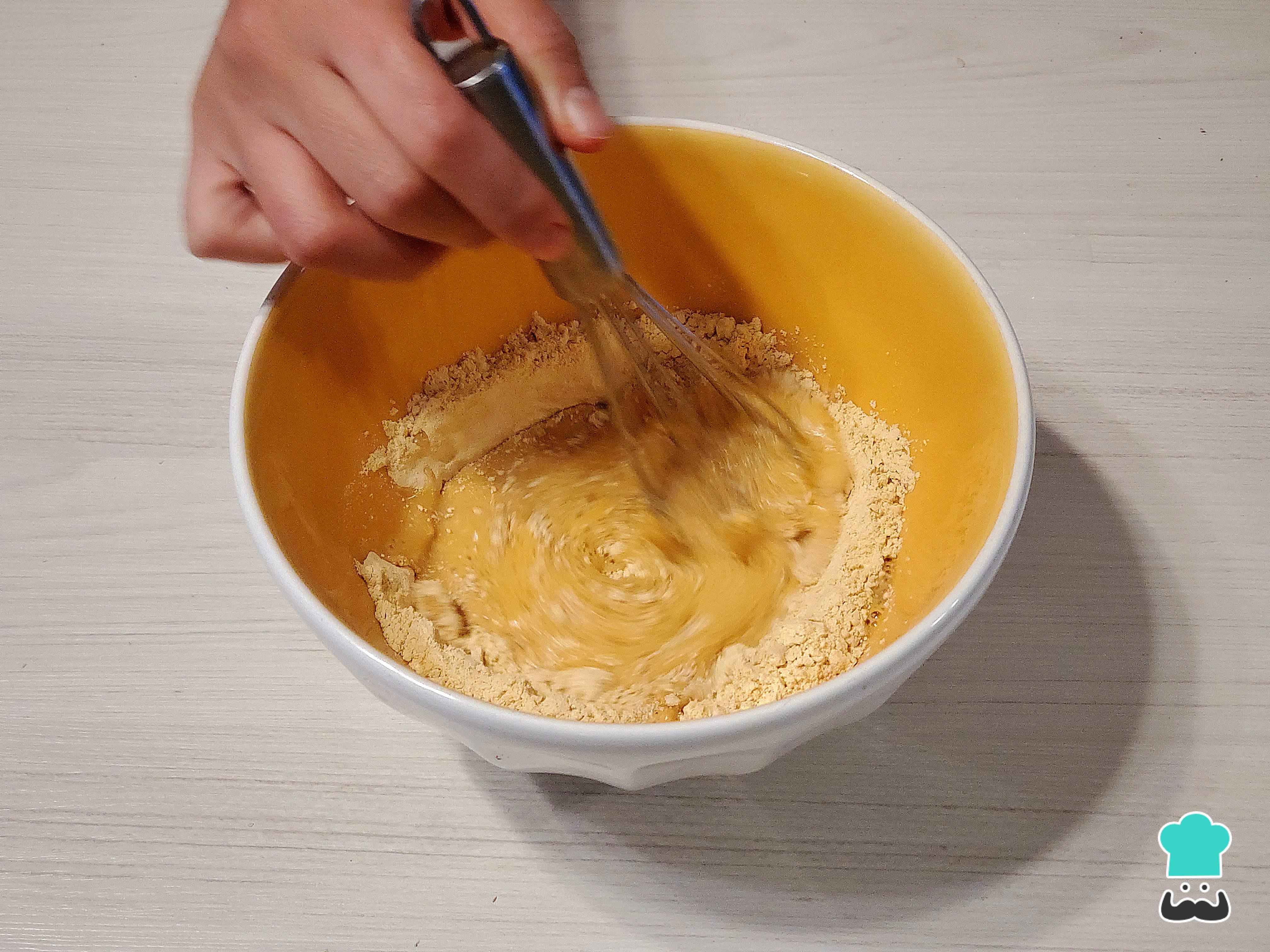 Vierte la harina de habas tostadas en un bowl mediano y disuélvelo con una taza de agua fría. Remueve bien con un batidor de globo hasta que no queden grumos.