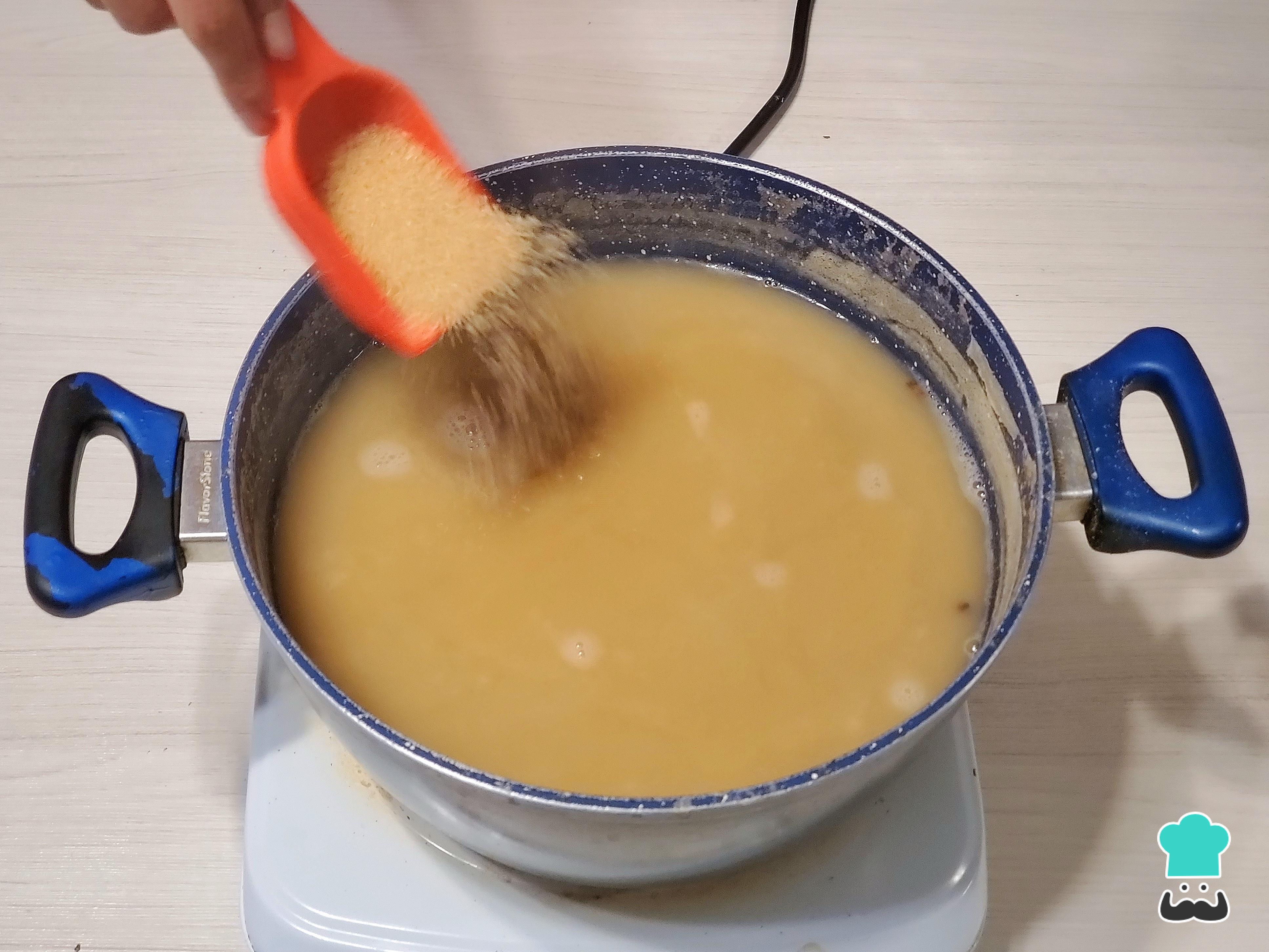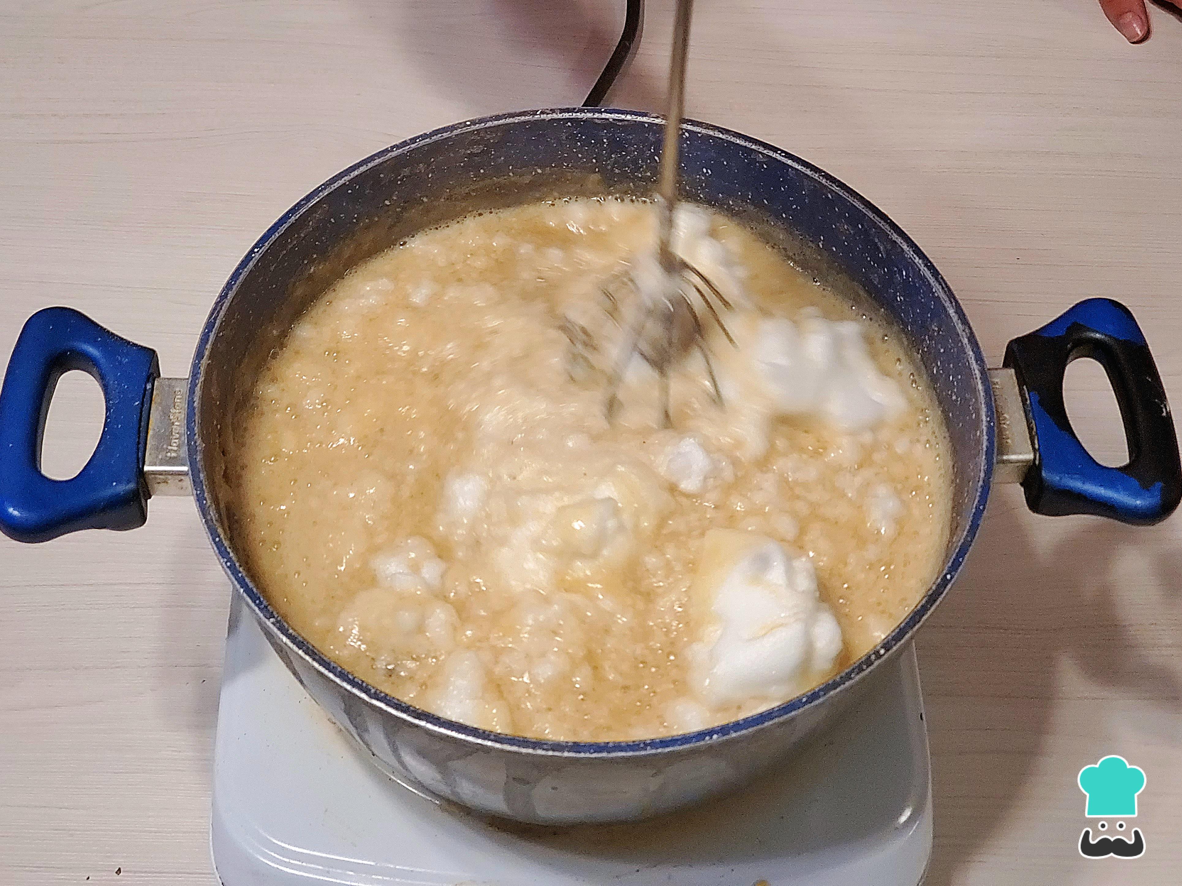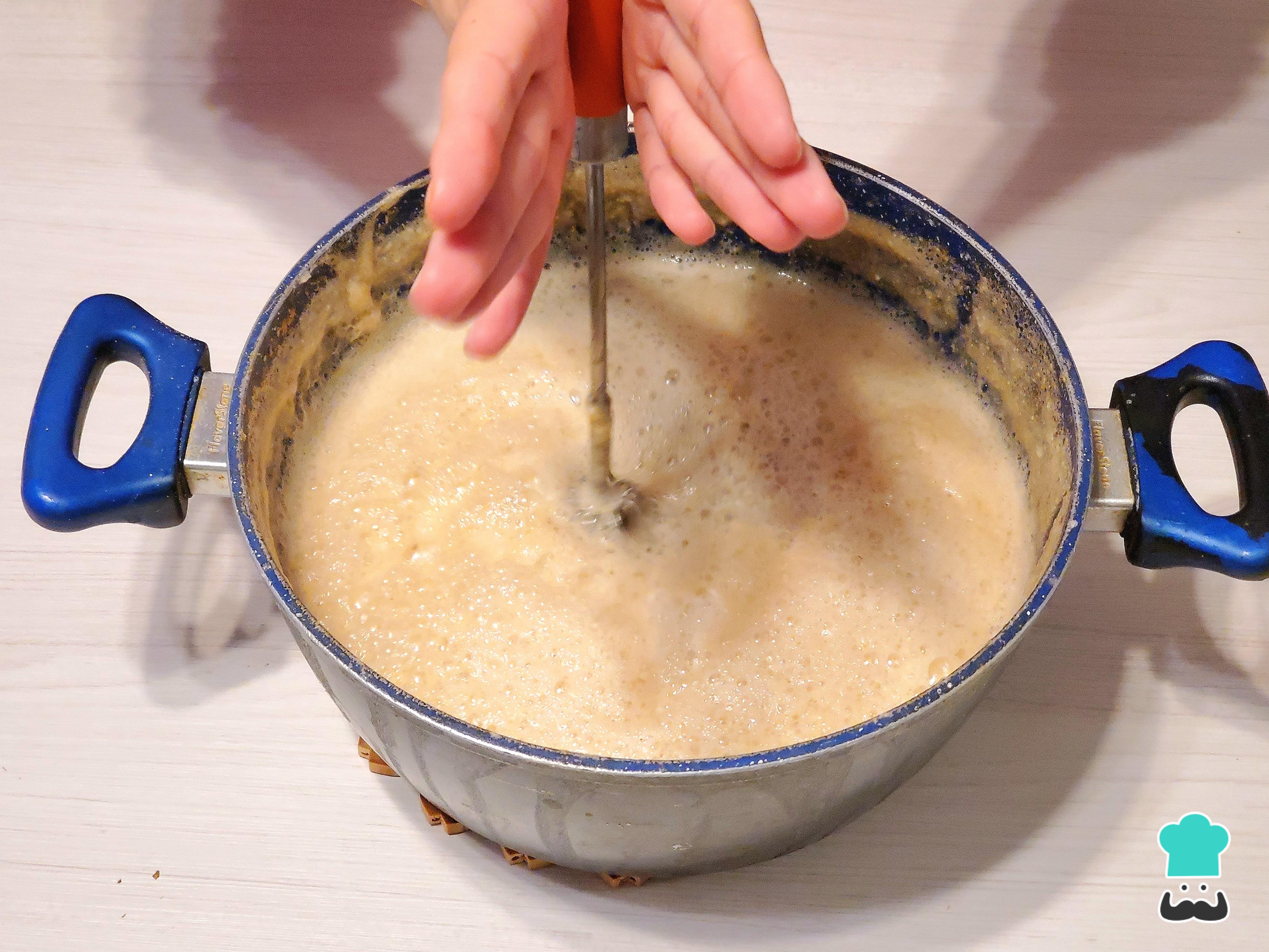Vierte esta mezcla de habas en la olla con agua hirviendo y remueve inmediatamente con el batidor de globo.