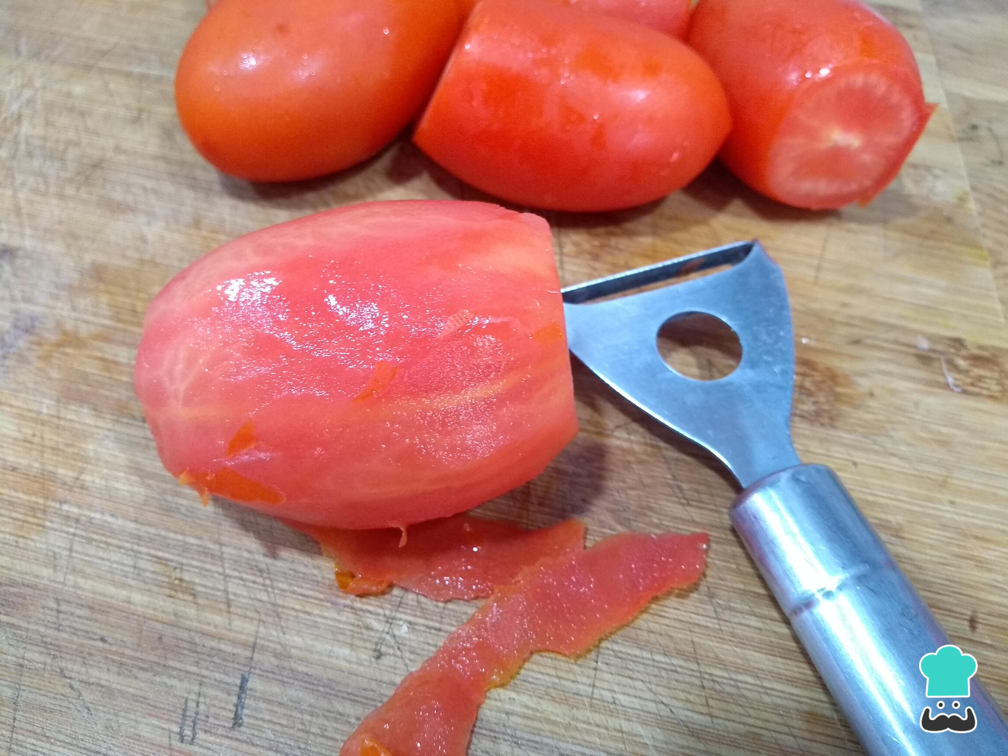 Comienza pelando los tomates con un pelapatatas o escaldándolos. Para esta segunda opción, deberás hacer un corte en cruz e introducirlos en agua hirviendo durante 30 segundos. Retíralos y tira de la piel por el corte.