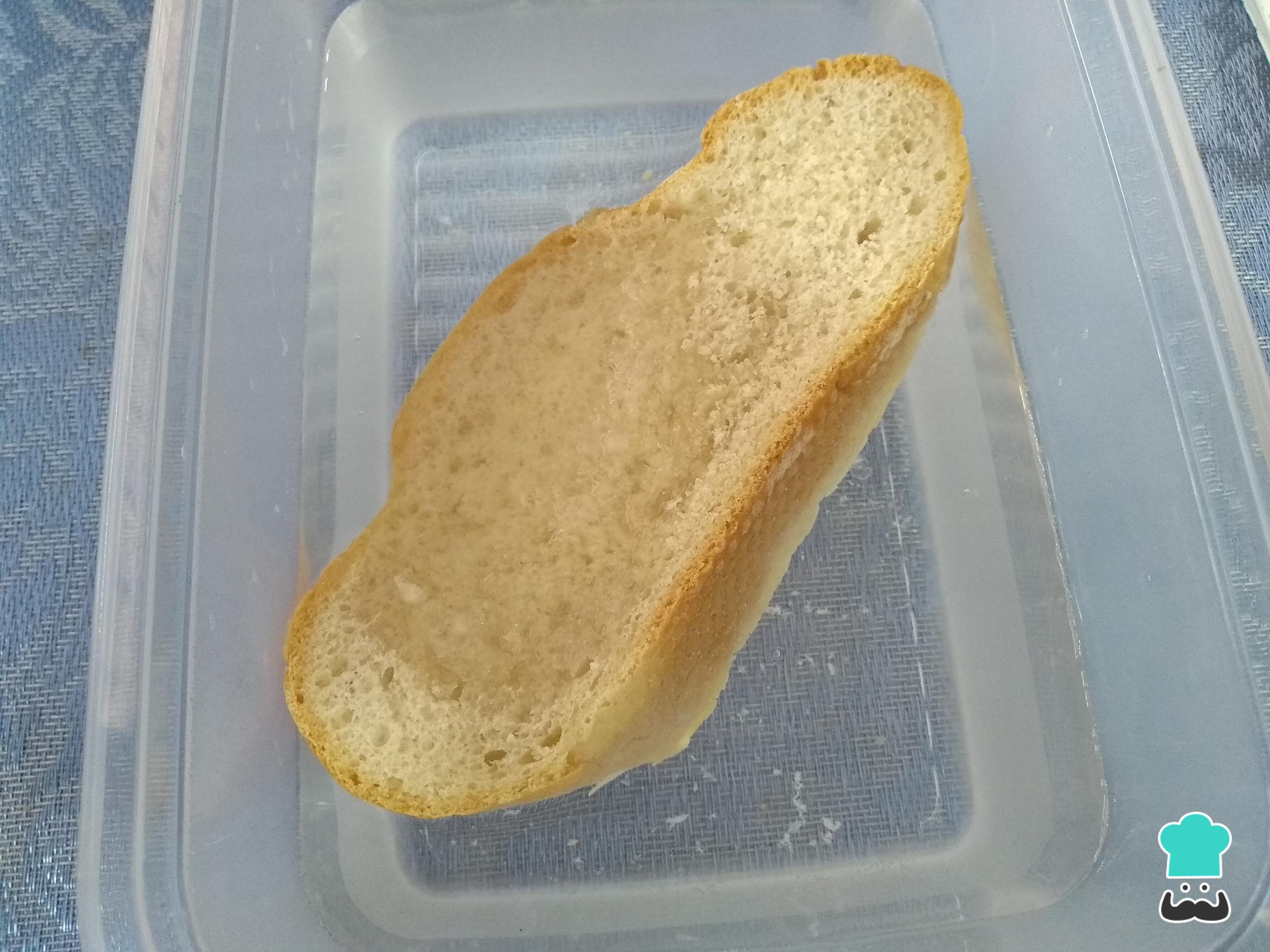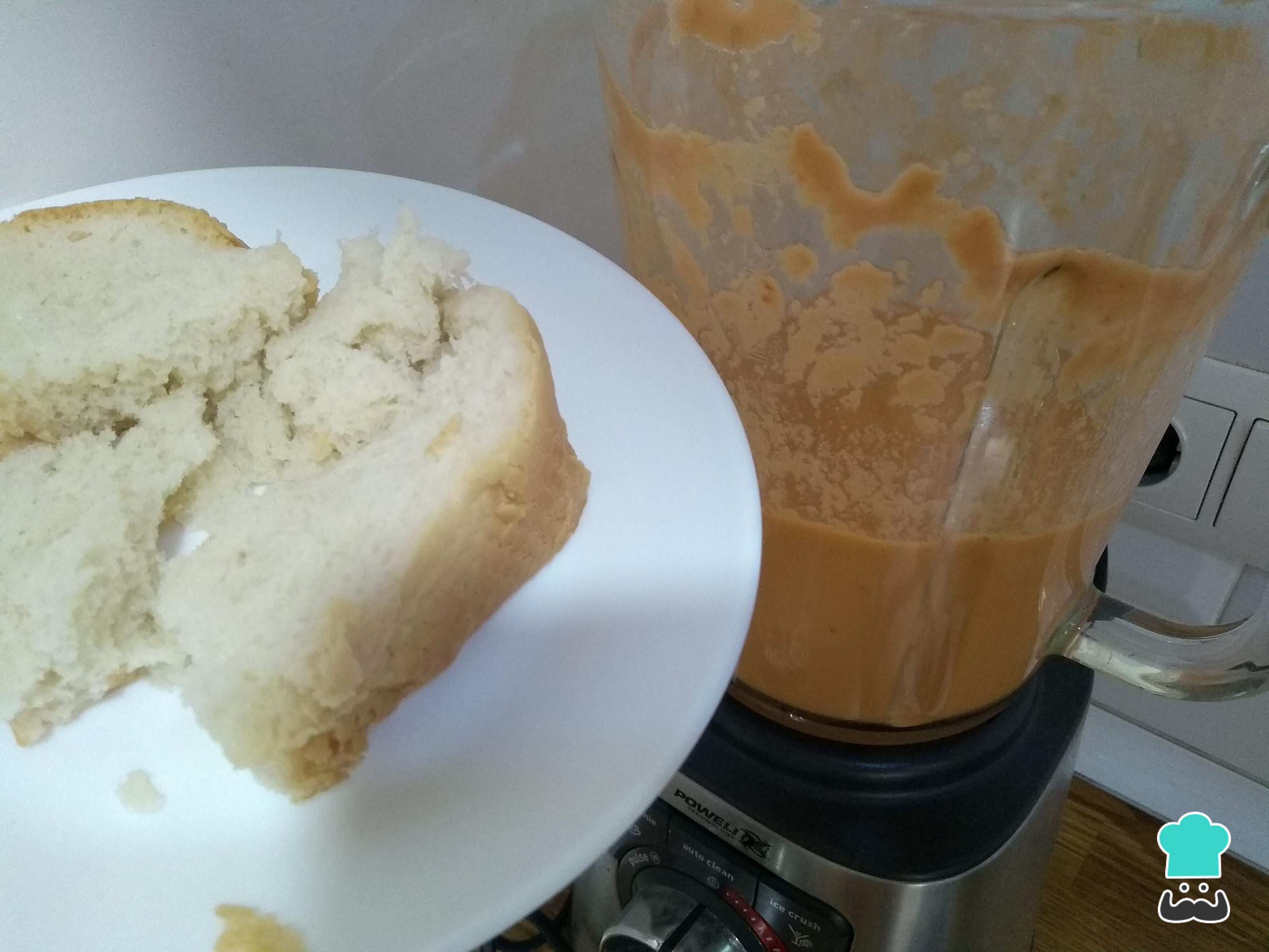 Añade una buena rebanada de pan en remojo para que se ablande y quede muy esponjosa. Mientras absorbe el agua, sigue con el resto de pasos de la receta de porra antequerana, así puedes ir aprovechando el tiempo.