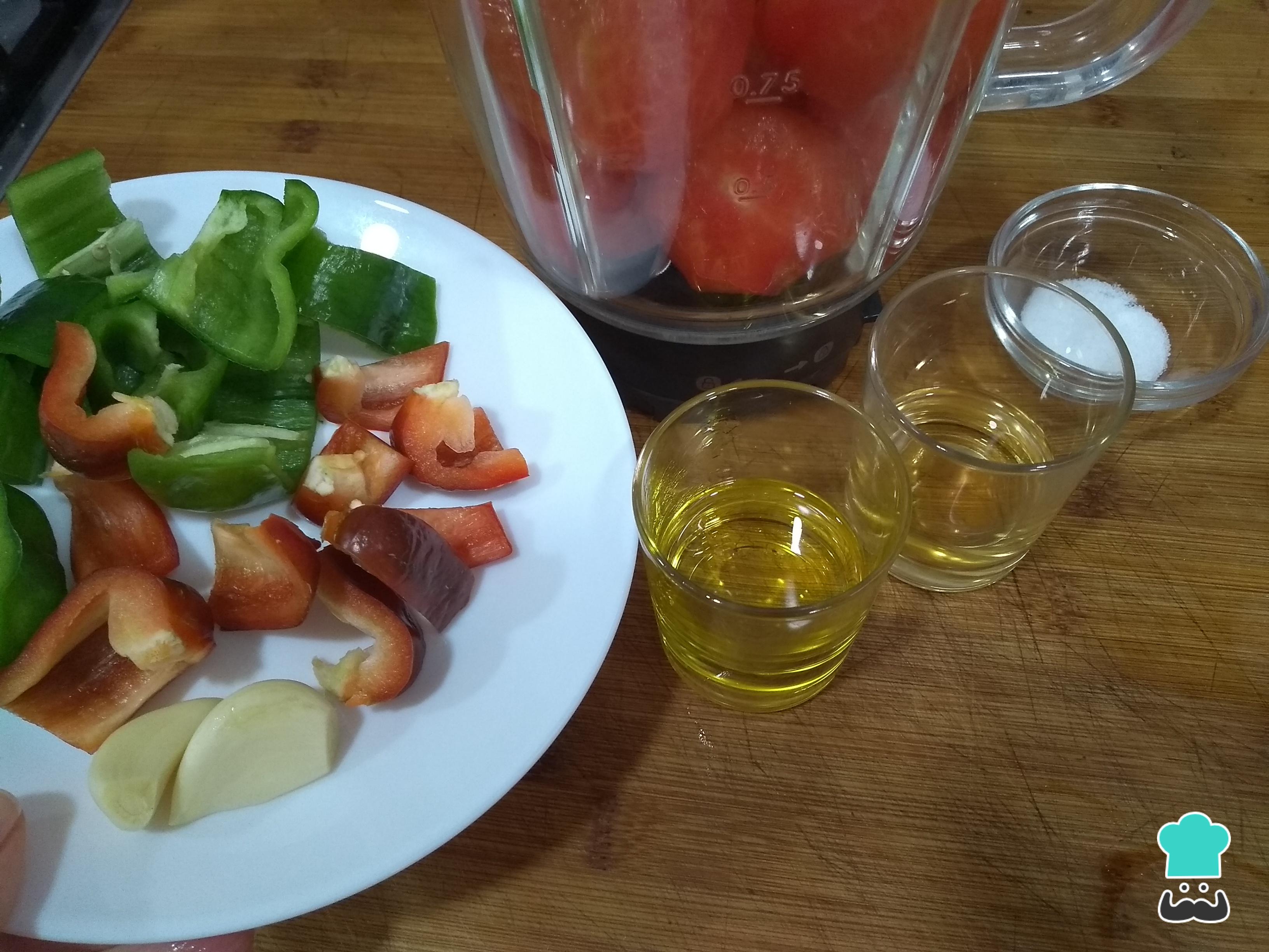 Corta en trozos medianos el ajo y los pimientos. No importa que no queden todos iguales porque los triturarás igualmente. Introduce los tomates ya sin piel en la licuadora o en el vaso de la batidora y empieza a triturarlos. Cuando quede una fina salsa de tomate, agrega los pimientos y el ajo y sigue batiendo.