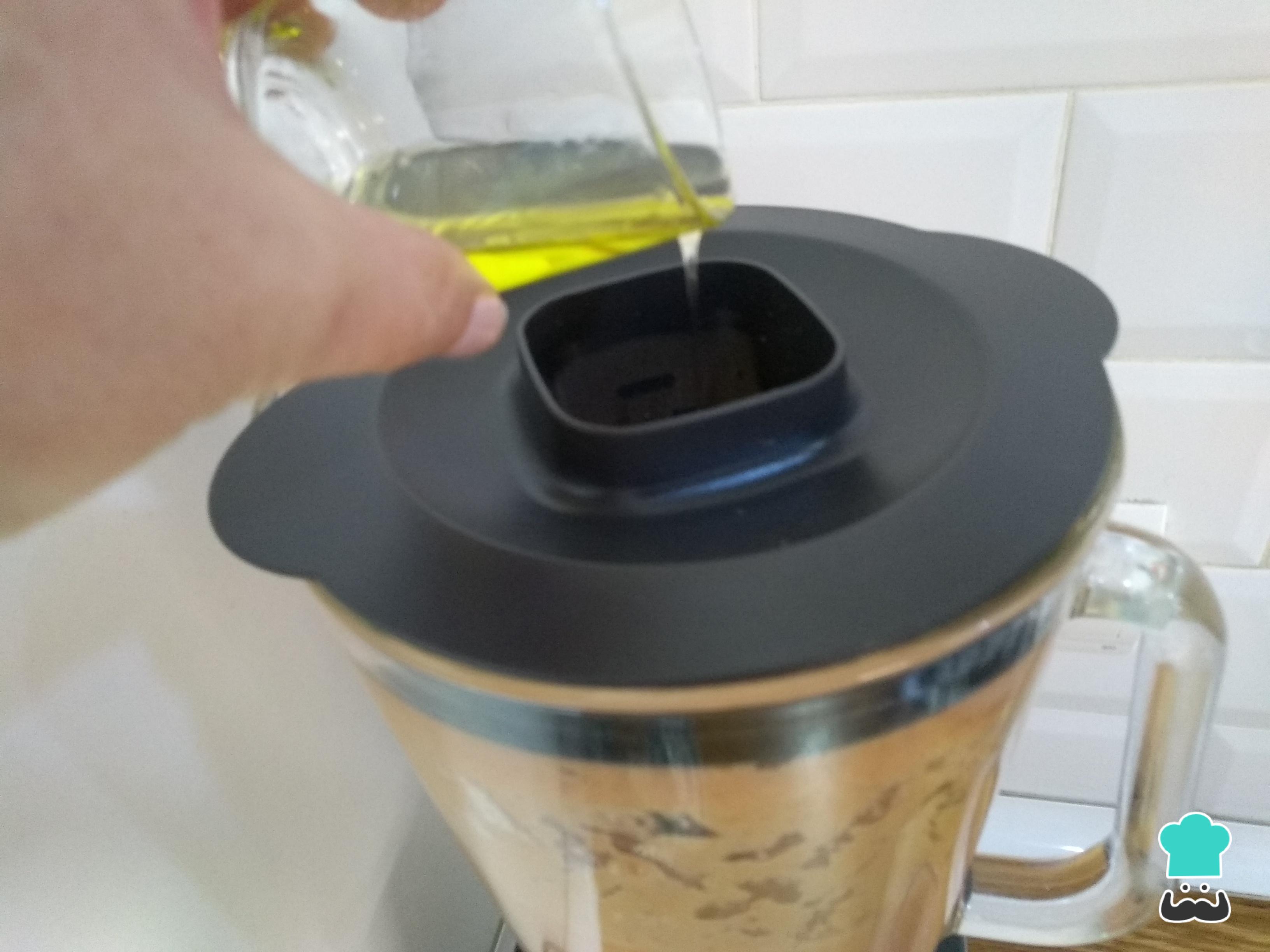 Bate durante 2 minutos y, a continuación, ve añadiendo consecutivamente la sal y el vinagre mientras continúas batiendo. Si usas licuadora puedes agregar estos ingredientes por el orificio superior, mientras que si estás empleando una batidora eléctrica de mano tendrás que ir añadiendo el vinagre en forma de hilo a la vez que bates. Por último, vierte lentamente el aceite para que vaya emulsionando la salsa y quede una porra antequerana cremosa.