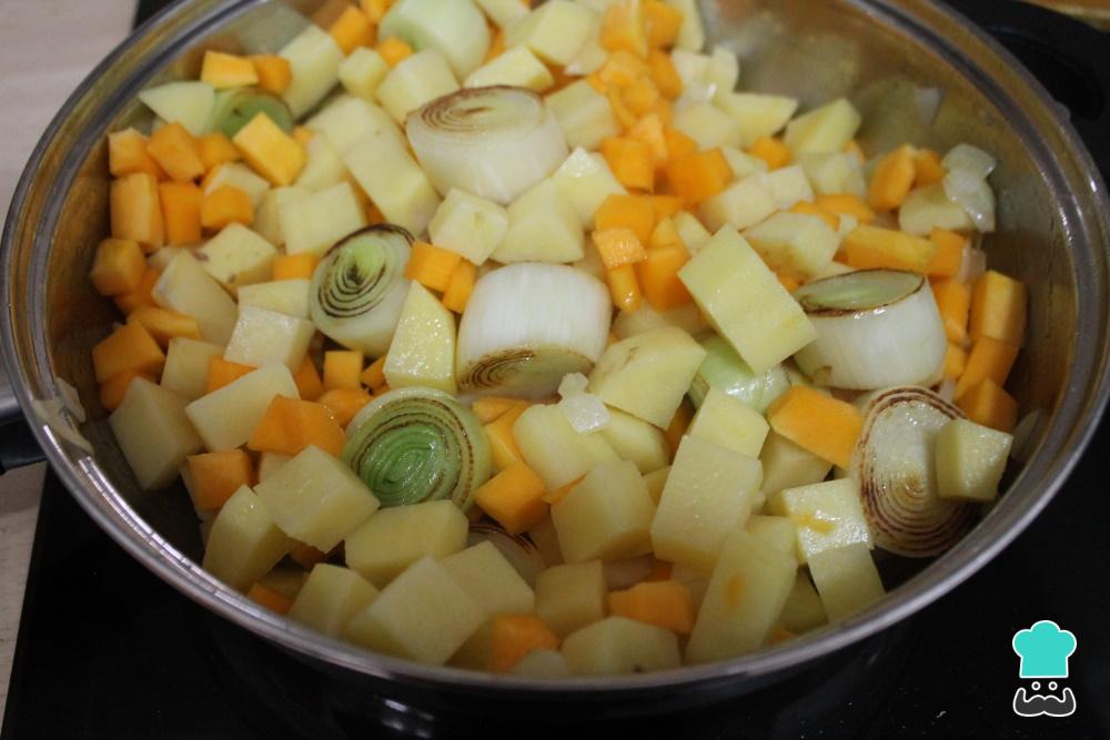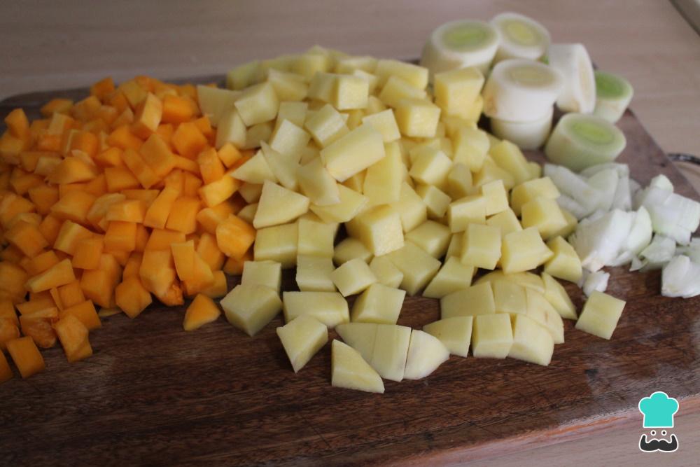 Lava el puerro y córtalo en rodajas de unos 2 centímetros. Pela las patatas, lávalas y córtalas en cubitos no muy grandes. Pela también el trozo de calabaza y trocéalo en cubitos no muy grandes. Pela un trozo de cebolla, más o menos la mitad de una no muy grande, y pícala.