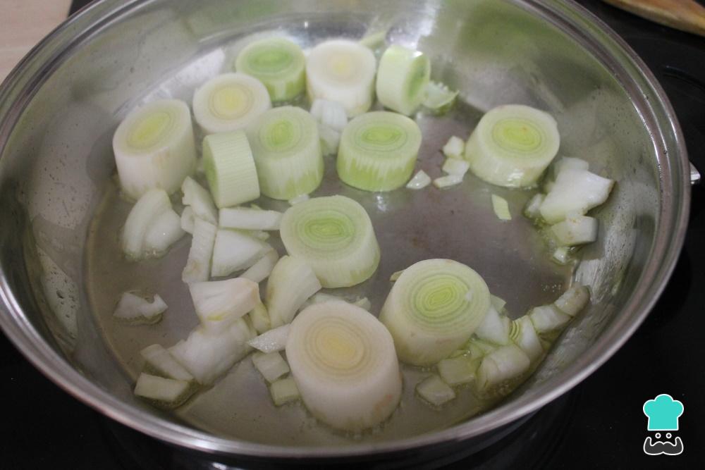 Pon una olla amplia al fuego y calienta 2 cucharadas de aceite. Cuando esté caliente, pocha el puerro y la cebolla durante 1 minuto.