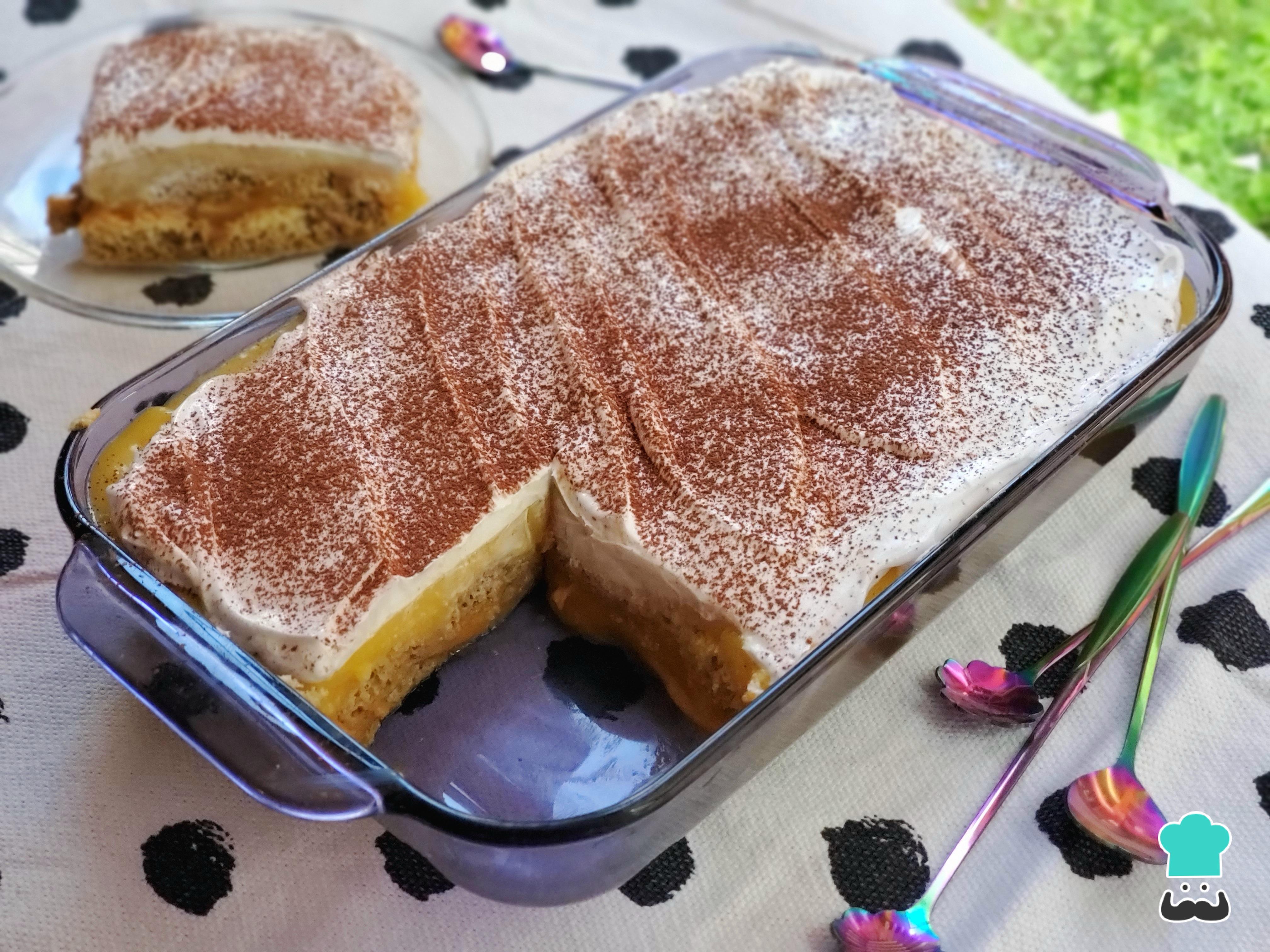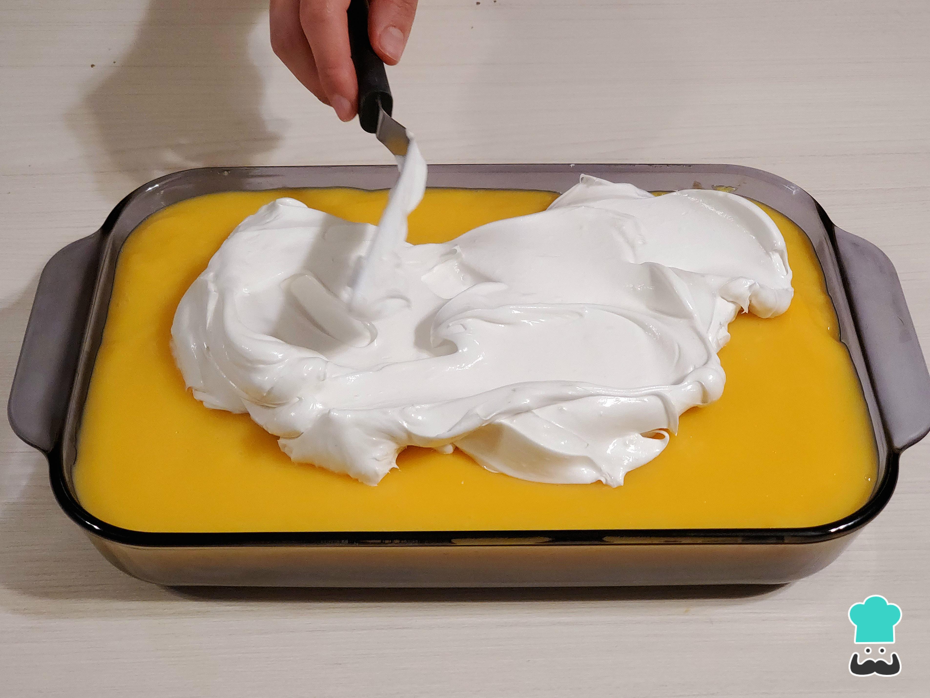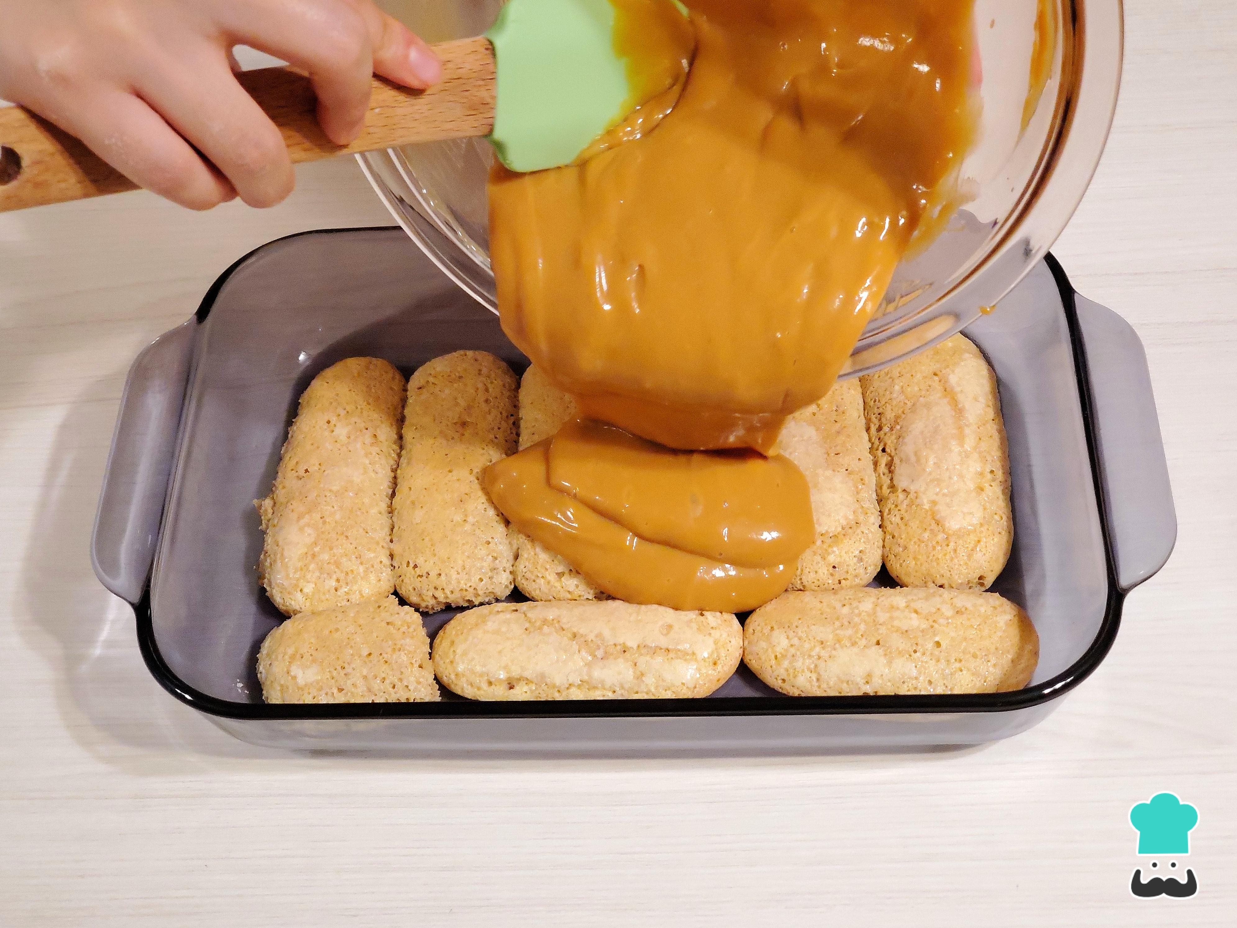 Una vez que hayas cubierto toda la base con las bizcotelas, vierte la crema pastelera de manjar blanco o dulce de leche por encima y distribúyela uniformemente con una espátula.