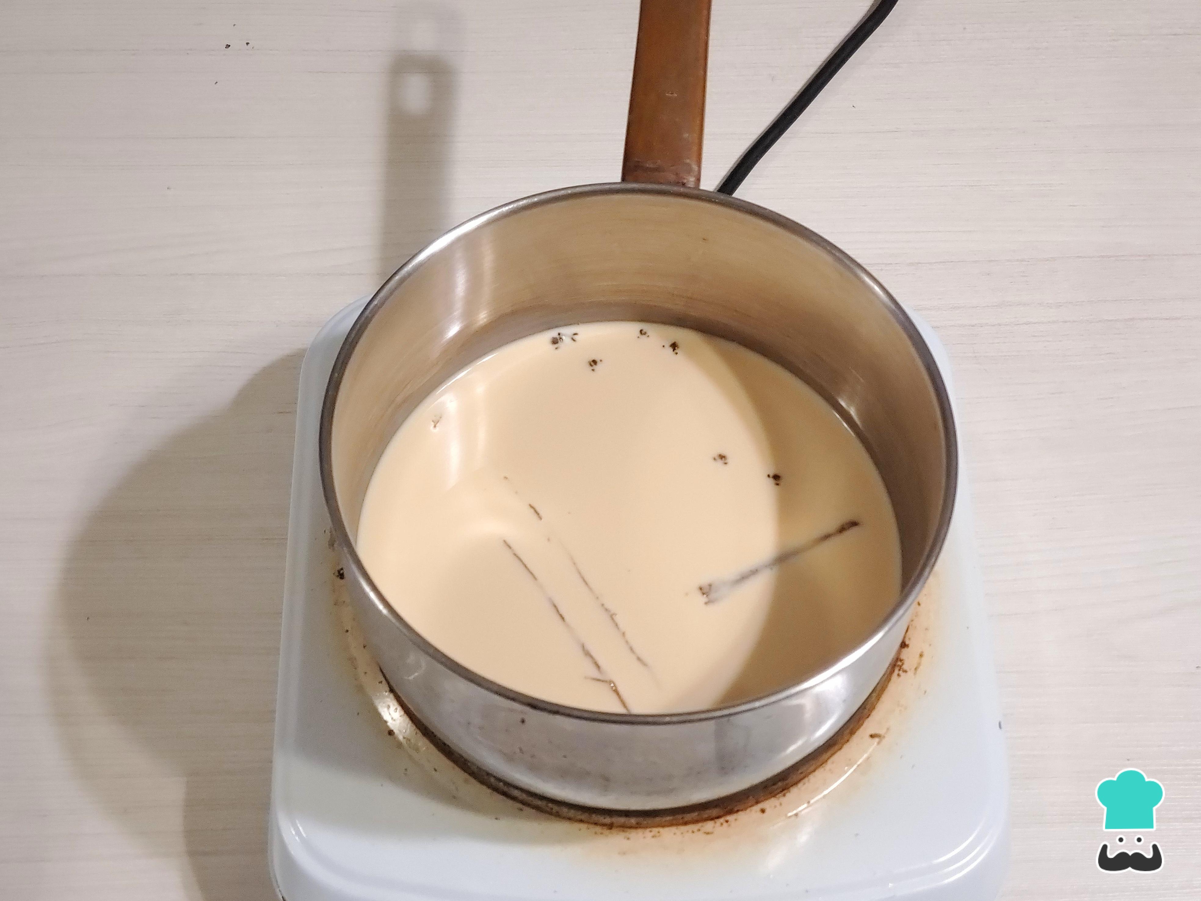 Aparte, prepara una crema pastelera. Vierte la leche en una olla y ponla a calentar. Si deseas, puedes aromatizarla con un chorrito de esencia de vainilla o con vainas de vainilla.