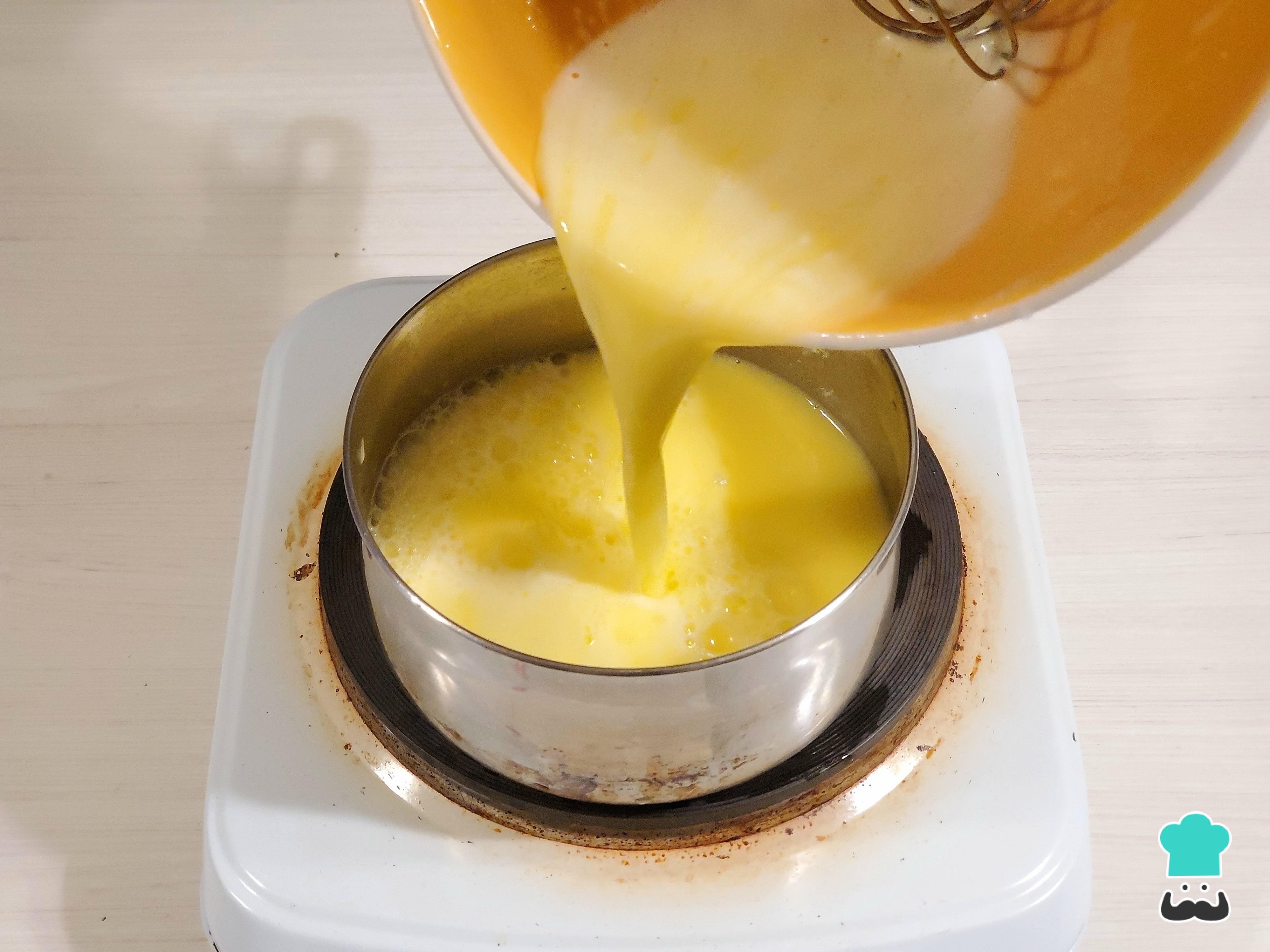 Cuando la leche esté a punto de hervir, retírala del fuego y viértela poco a poco sobre la mezcla de yemas, removiendo constantemente con el batidor de globo para evitar que los huevos se coagulen.