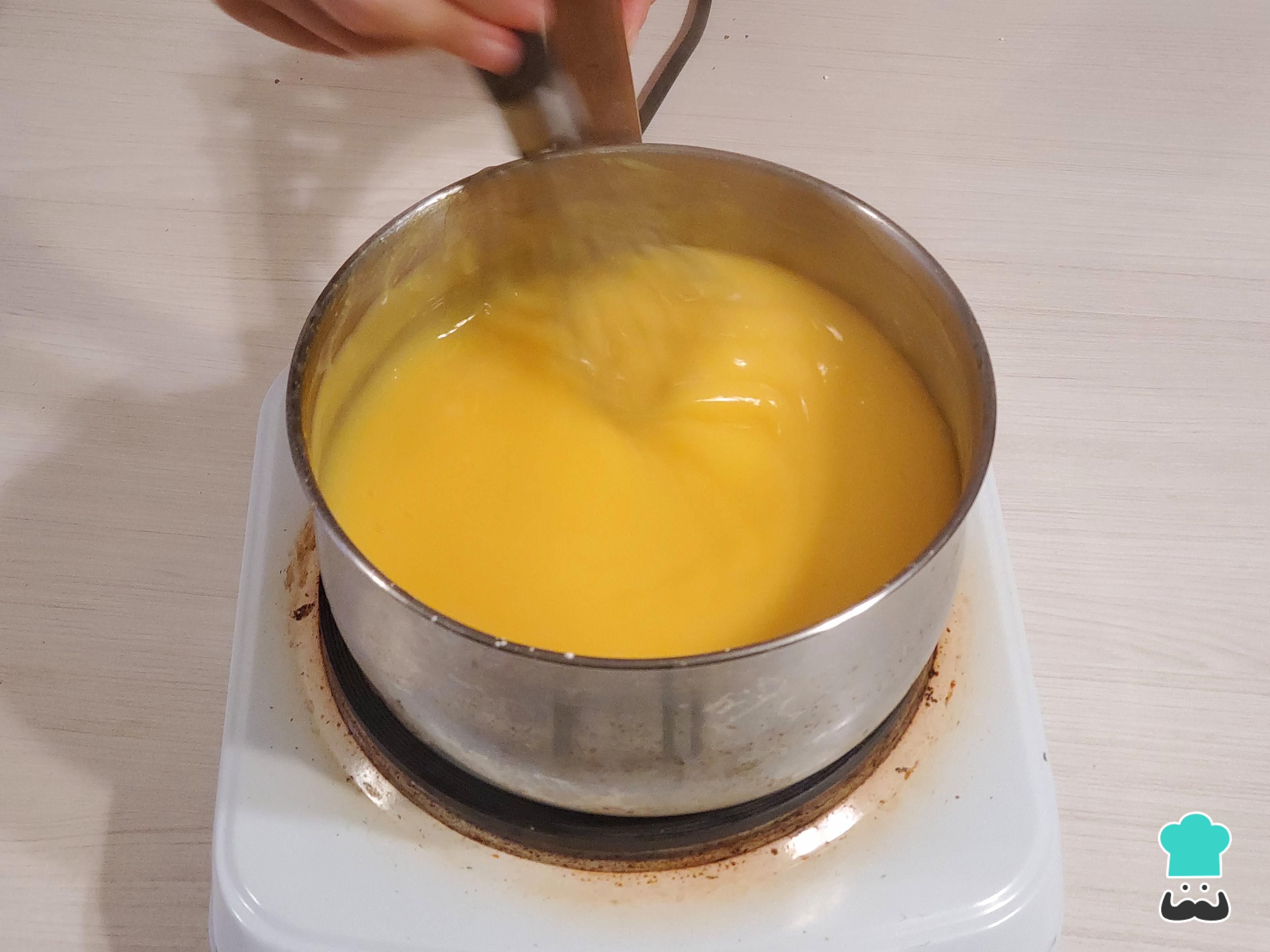 Vuelve a poner esta mezcla en la olla y enciende el fuego a temperatura media. Remueve continuamente hasta que la mezcla comience a hervir y mantén la cocción durante otros 3 minutos para asegurarte de que la fécula de maíz esté bien cocida.