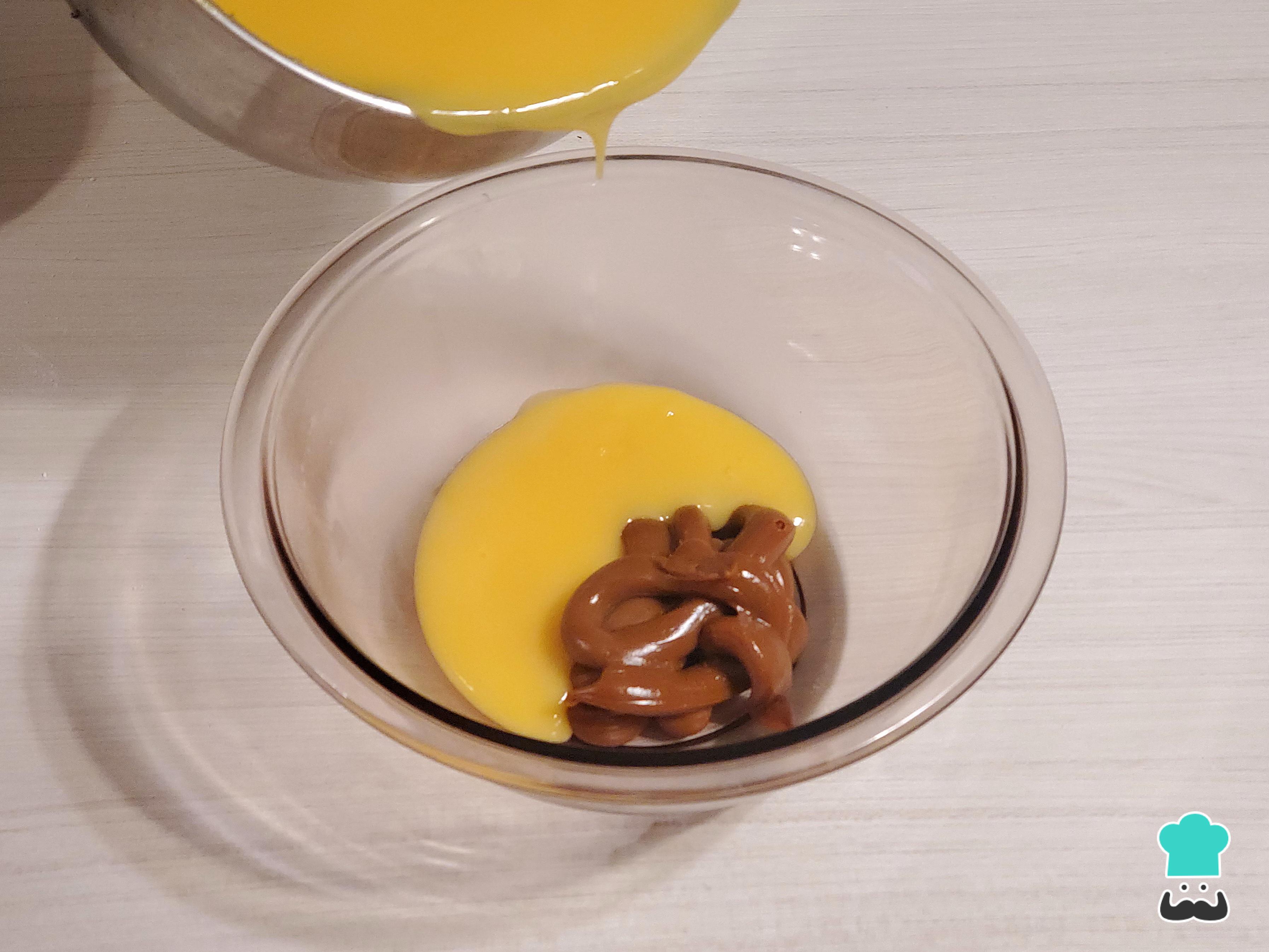 Retira la mezcla del fuego y separa la mitad, cubriéndola con papel film en contacto y dejándola enfriar en el refrigerador. La otra mitad viértela sobre el manjar blanco y mezcla bien con el batidor de globo hasta obtener una crema homogénea.
