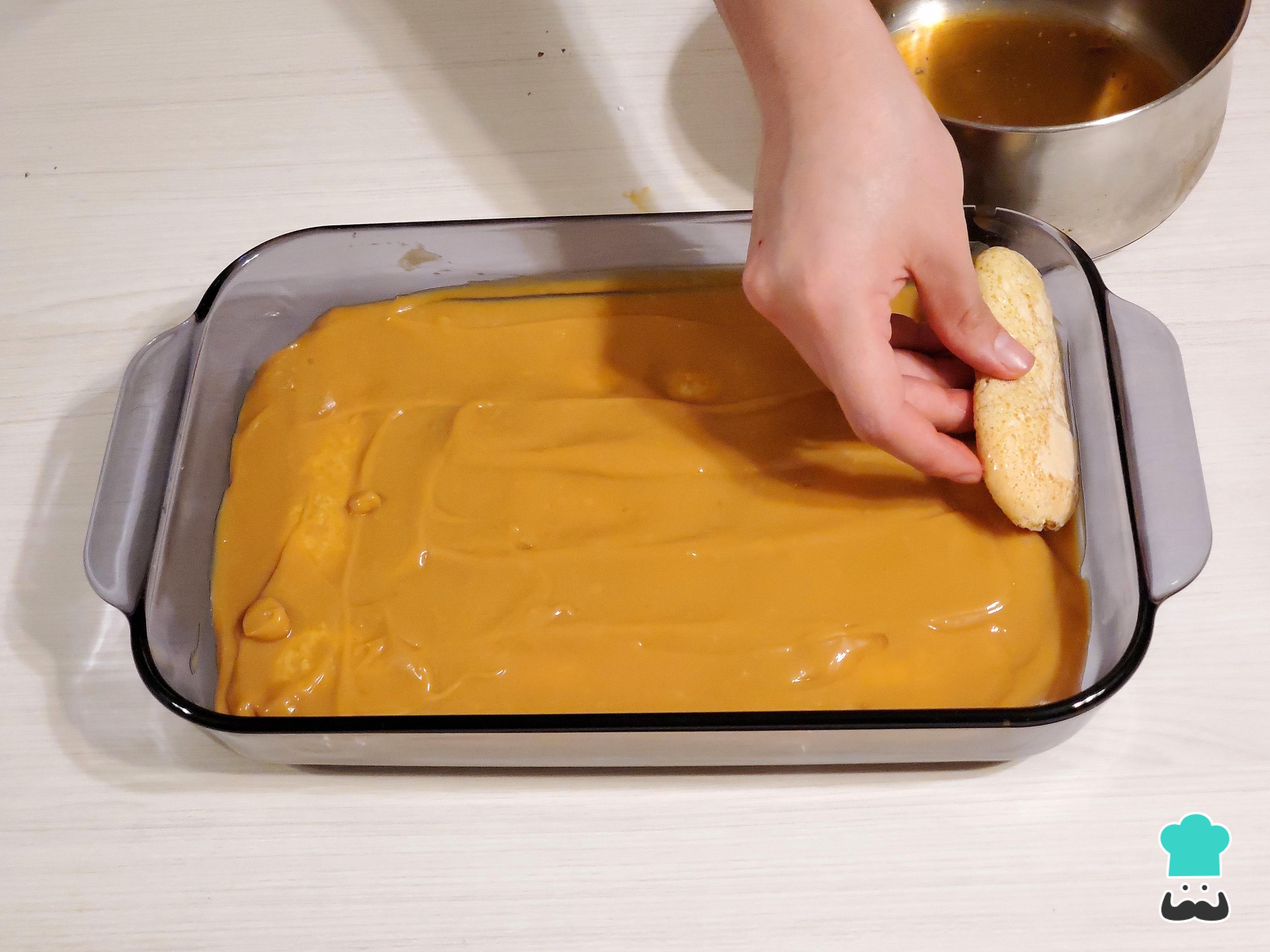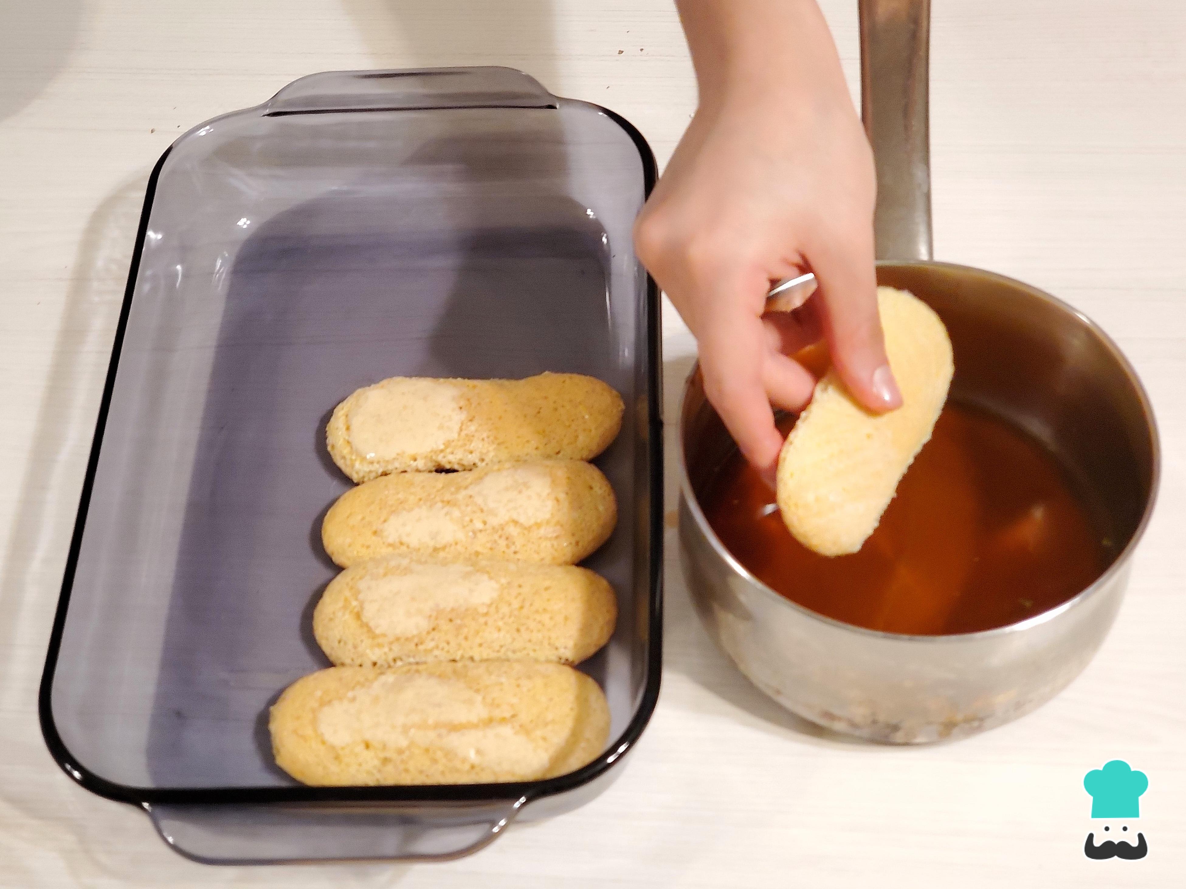 Para armar el postre, coloca las bizcotelas en una bandeja profunda y sumérgelas una a una en el almíbar, dándoles la vuelta rápidamente para evitar que se deshagan. Colócalas cuidadosamente en la base de la bandeja.