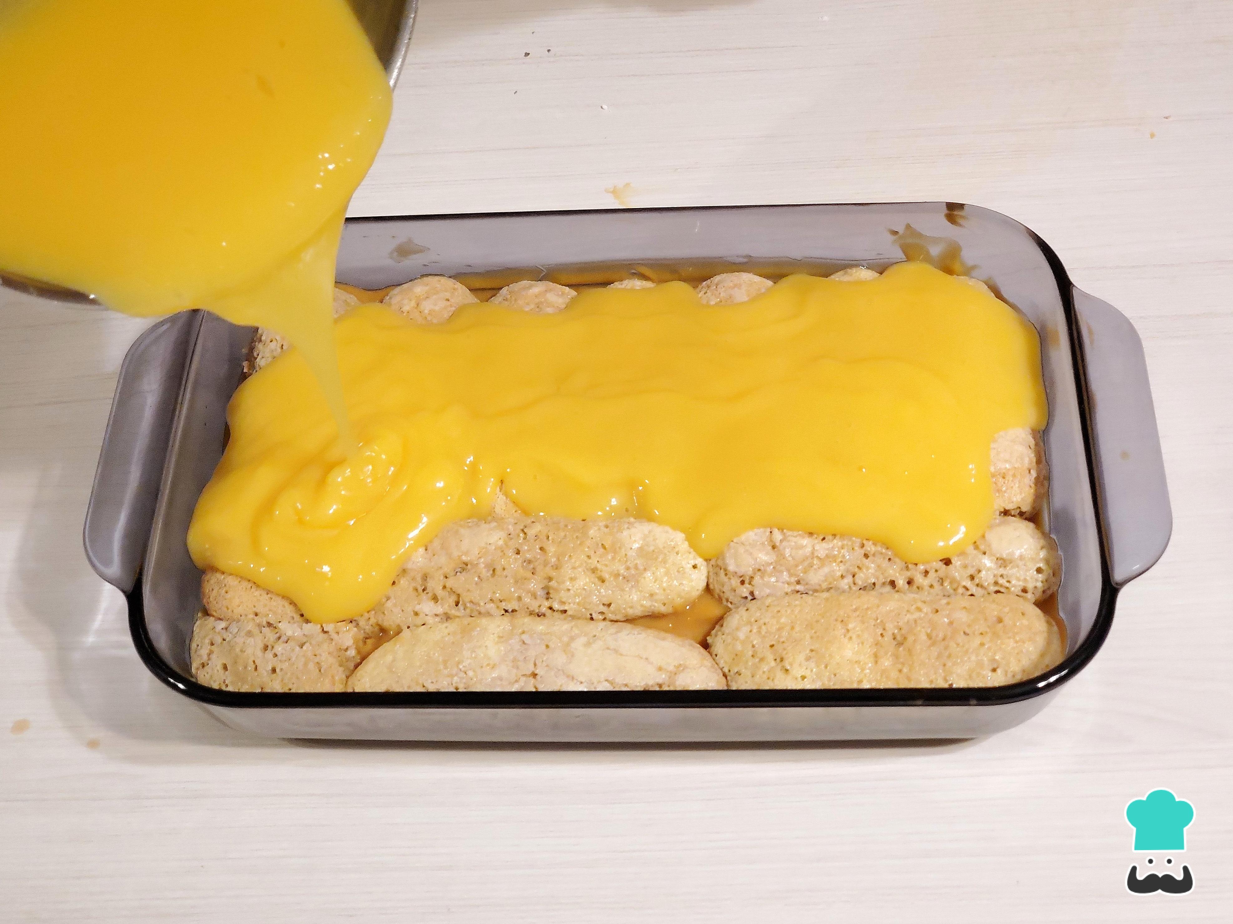 Cubre esta cama de bizcotelas con la crema pastelera de vainilla. Si la crema está muy espesa, bátela un poco antes de volcarla en el molde para que quede suave y untable.