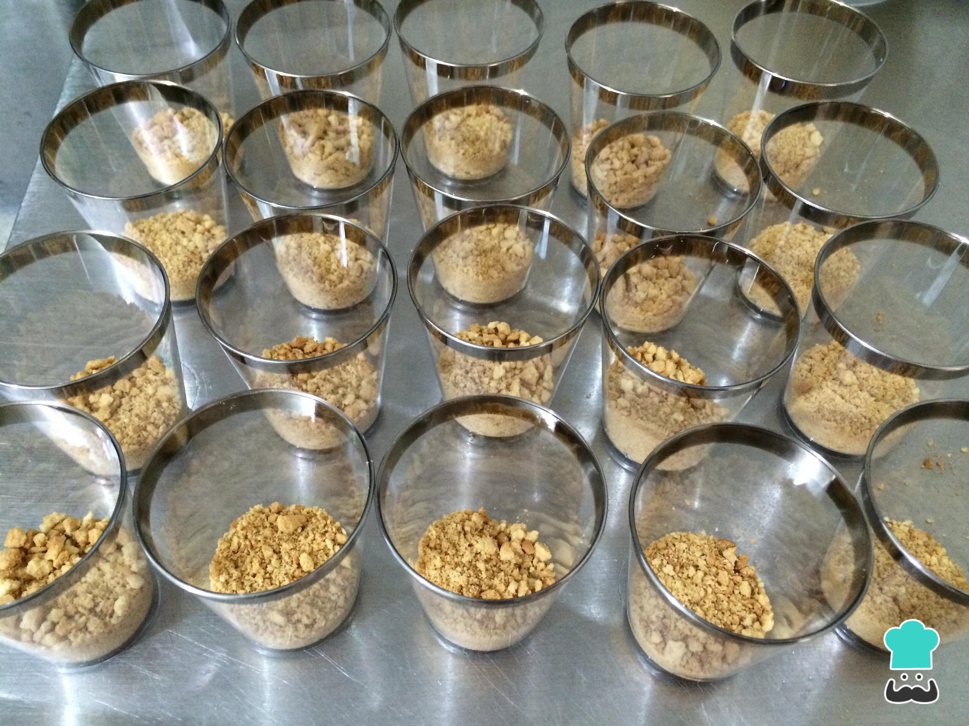En los vasos pequeños, añade una cucharadita de las galletas trituradas y acomódalas bien.