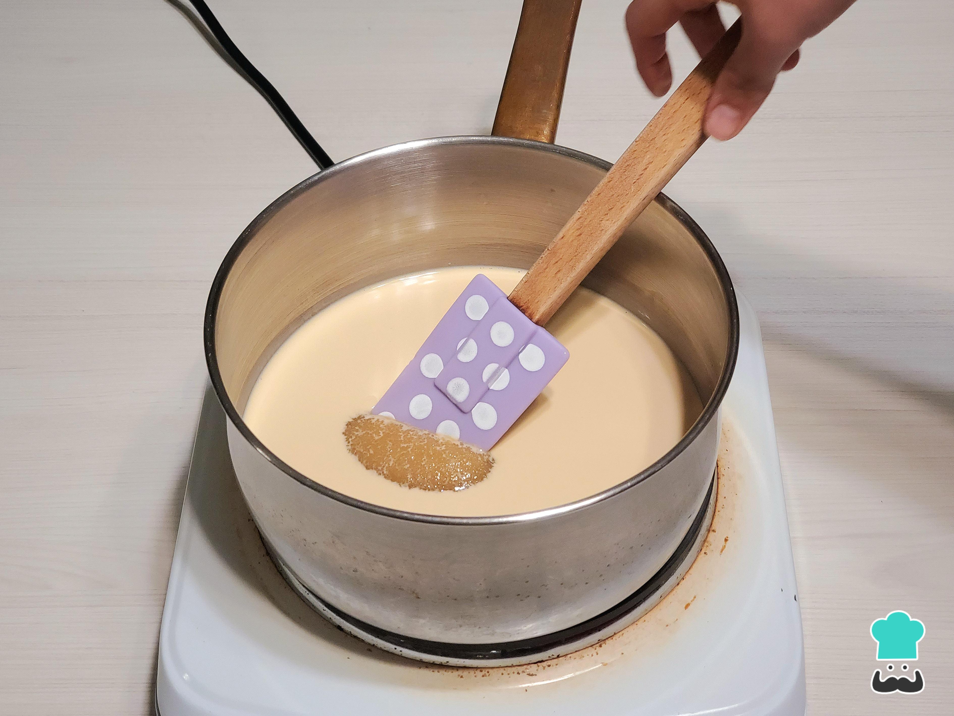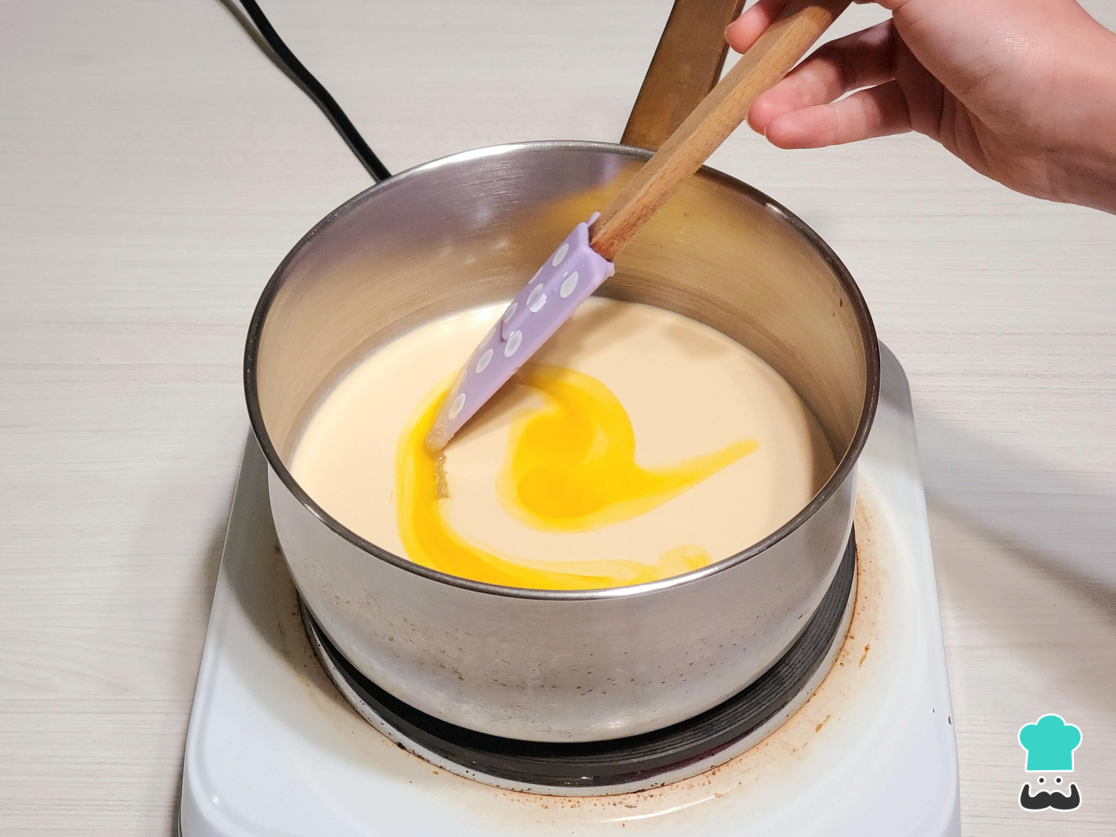 Aun frío, añade las yemas y los huevos batidos, removiendo bien. A continuación, enciende el fuego a temperatura media y remueve hasta que el azúcar se disuelva y la mezcla rompa a hervir. Es importante que la olla sea alta para evitar que la leche rebalse.