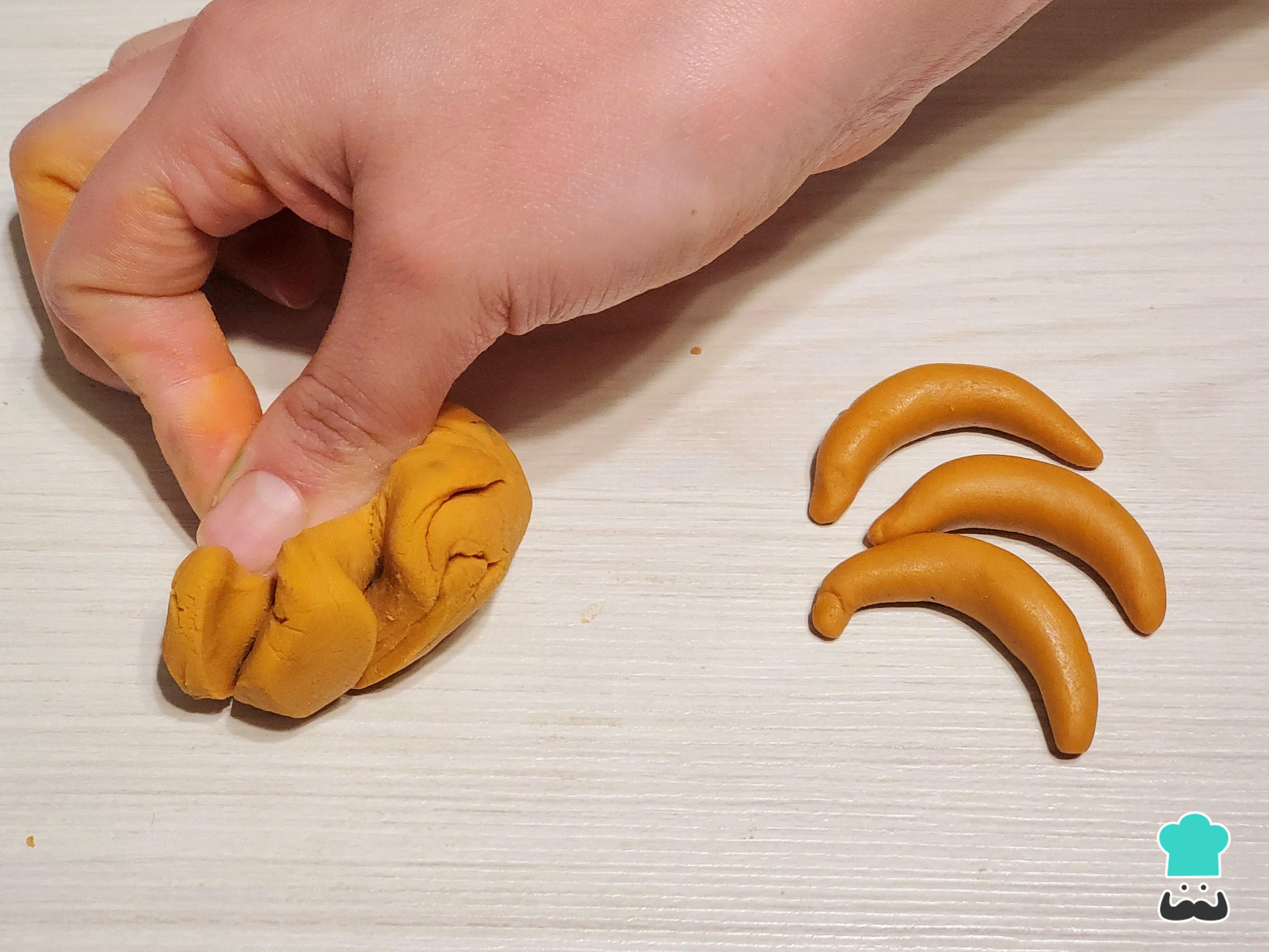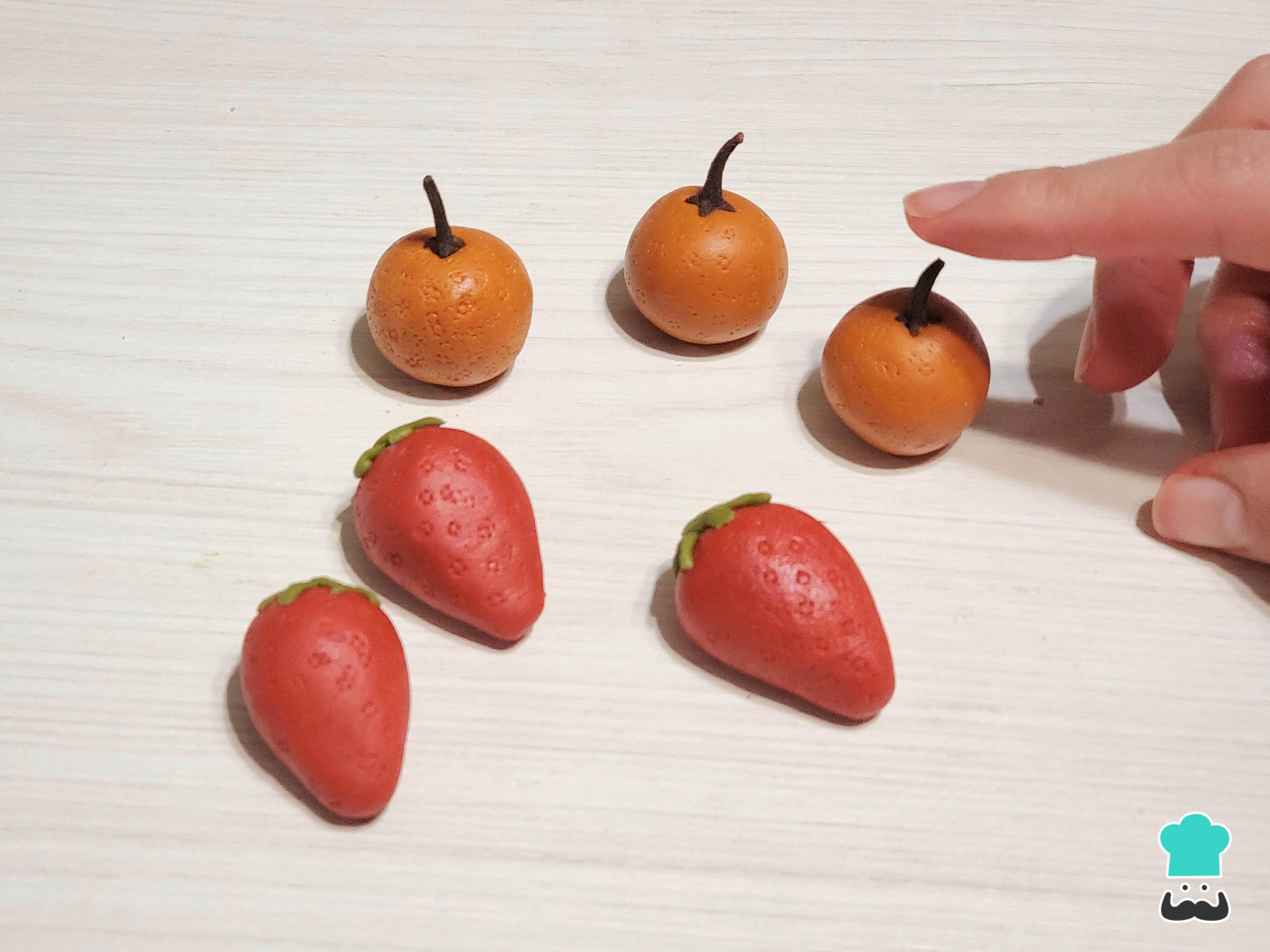 Divide la masa en cuatro porciones y envuélvelas en papel film para que no se sequen. Luego, tiñe cada porción del color de la fruta correspondiente: rojo para fresas, verde para peras, naranja para duraznos y naranjas, y amarillo para plátanos.