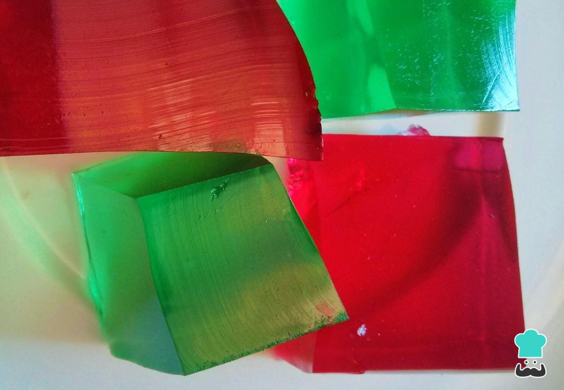 Cuando las gelatinas estén listas, córtalas todas en cuadros del tamaño que desees. En función de si preparas un único postre para todos o varios individuales, deberás cortarlos más o menos pequeños.