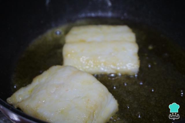 Desala los trozos de bacalao teniéndolos 48 horas en remojo y cambiando el agua cada 8 horas. También puedes hacer la receta de alubias con bacalao ya desalado y congelado al punto de sal. Pon unas cucharadas de harina en un plato, secamos los trozos de bacalao, pásalos por la harina y fríelos a fuego fuerte un minuto por cada lado.