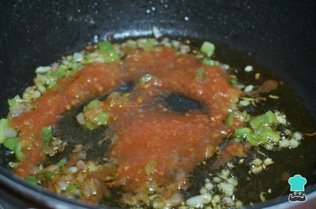Pela y pica la cebolla y los dientes de ajos, lava el pimiento y córtalo en trozos pequeños. Calienta una cazuela con un chorro de aceite, pocha la cebolla muy picada, añade el pimiento verde, póchalo y agrega los dientes de ajos picados. Antes de que se doren los ajos, incorpora el tomate triturado. Cocina unos minutos todo junto. Añade la cucharadita de pimentón dulce, remueve y mezcla.
