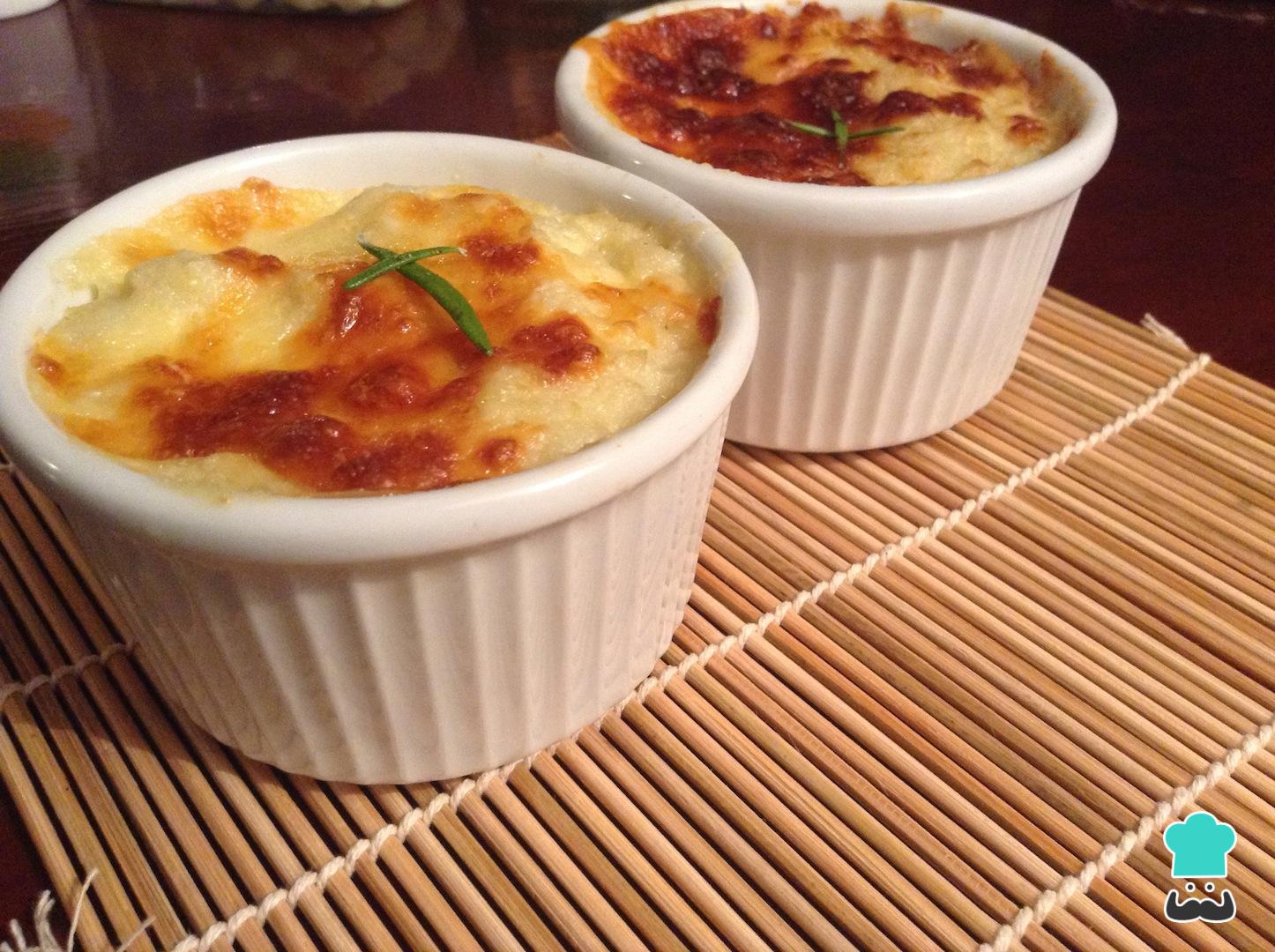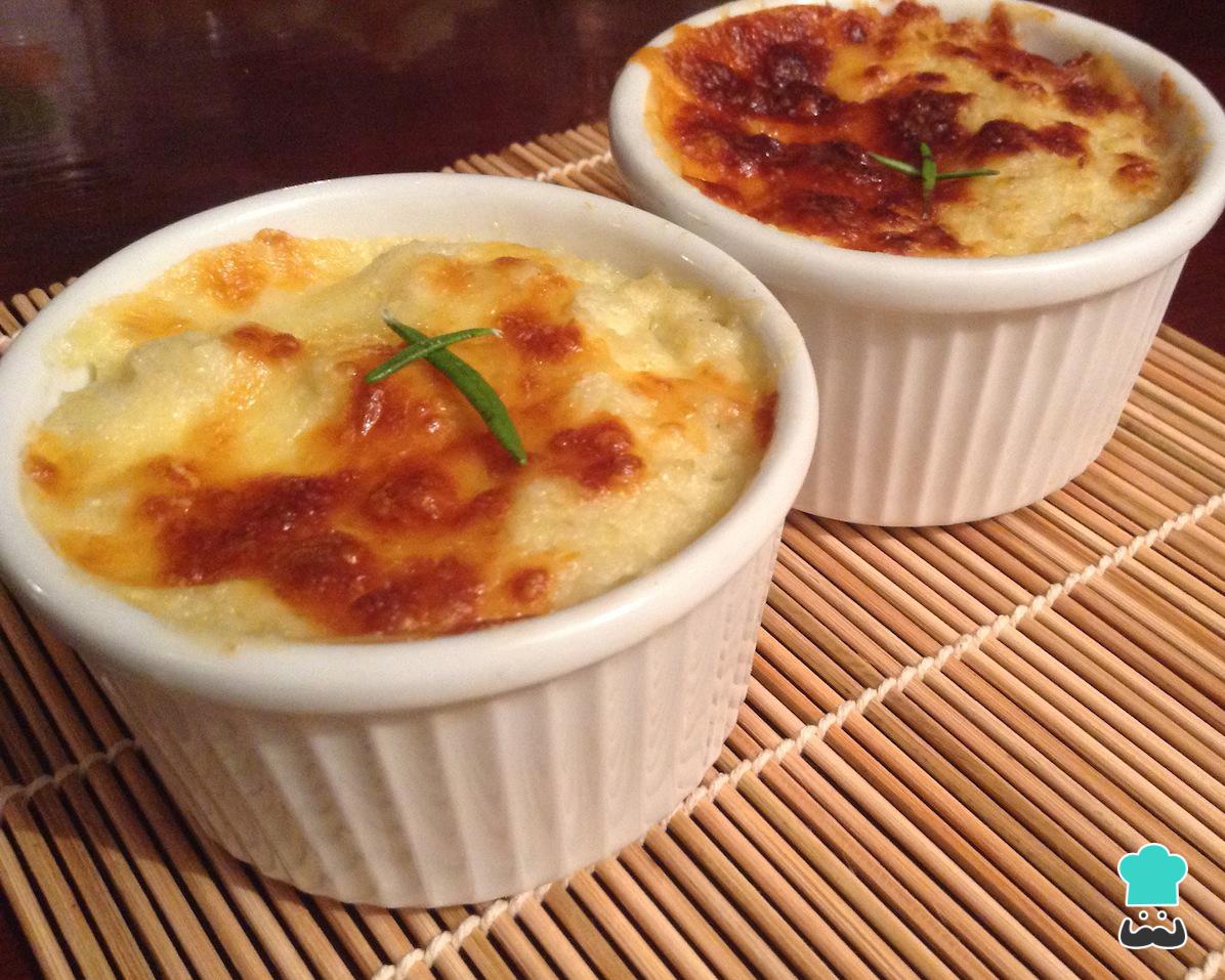Lleva el puré saludable a unas refractarias previamente engrasadas, adiciona el puré de coliflor en cada una de ellas bien distribuido.
