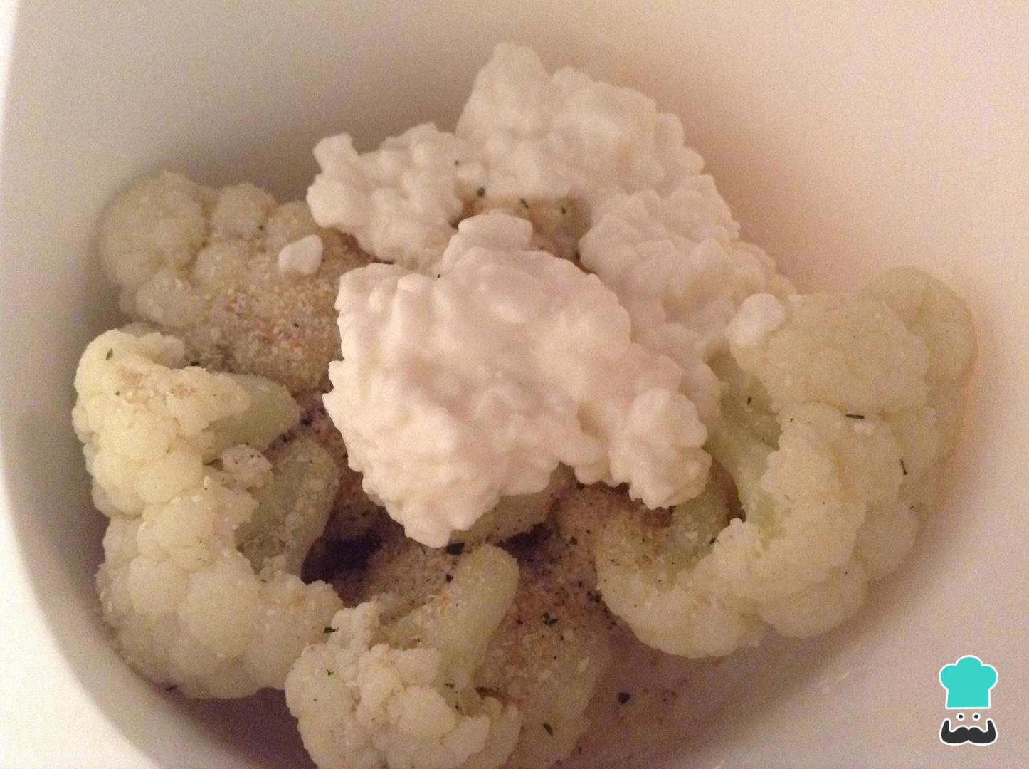 Lleva la coliflor cocinada a un bol con una pizca de sal de ajo, sal de cebolla y el queso cottage. Debes procesar en una licuadora o con la ayuda de un procesador hasta que se integren todos los ingredientes de la receta.