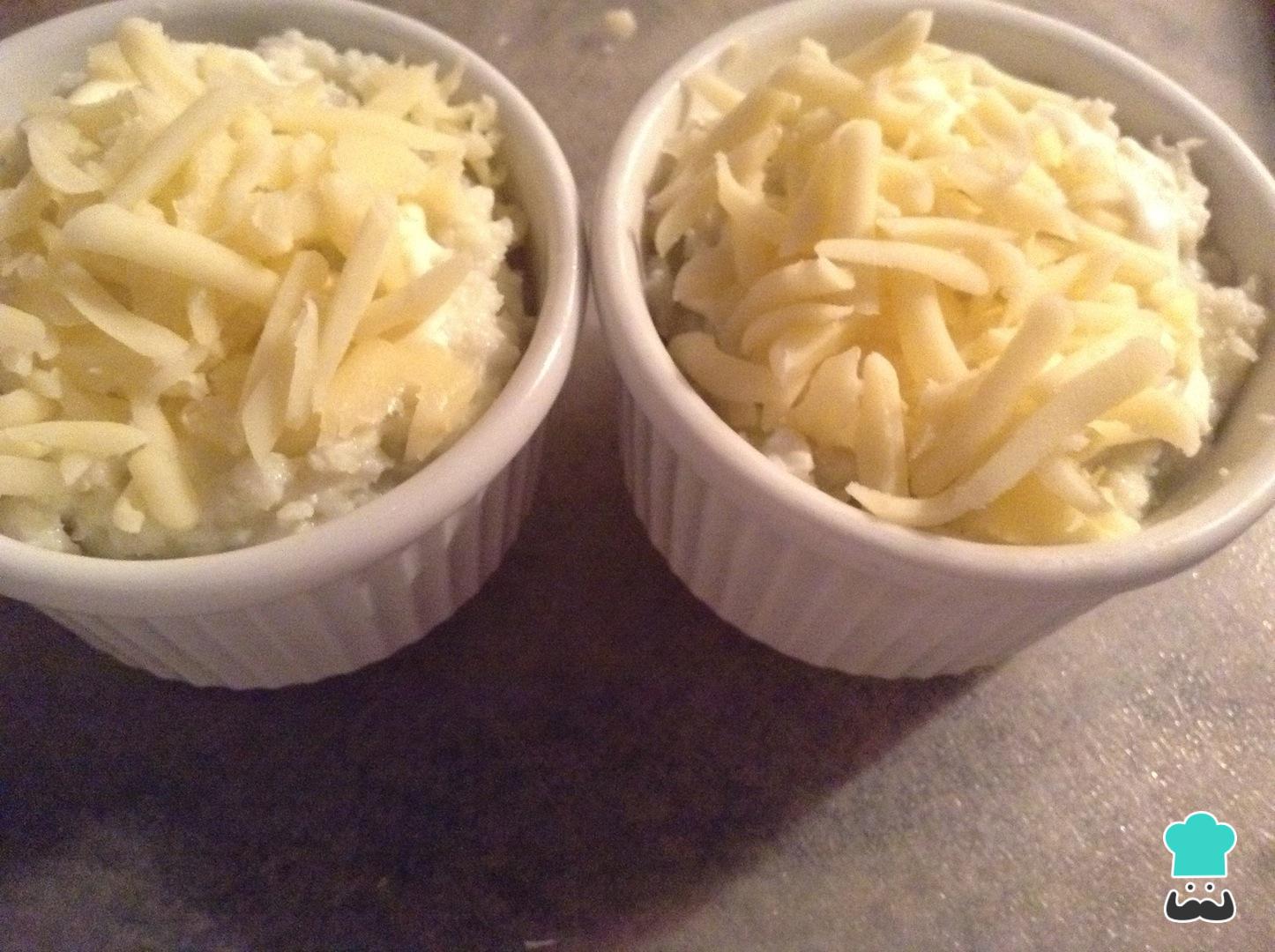 Adiciona en cada una de las refractarias un poco de queso mozzarella rallado y queso parmesano al gusto, lleva cada una de las refractarias individuales a 180ºC hasta que los quesos gratinen, si deseas puedes realizar una refractaria unificada, a mí me gusta hacer porciones individuales pero eso ya es más a gusto personal.