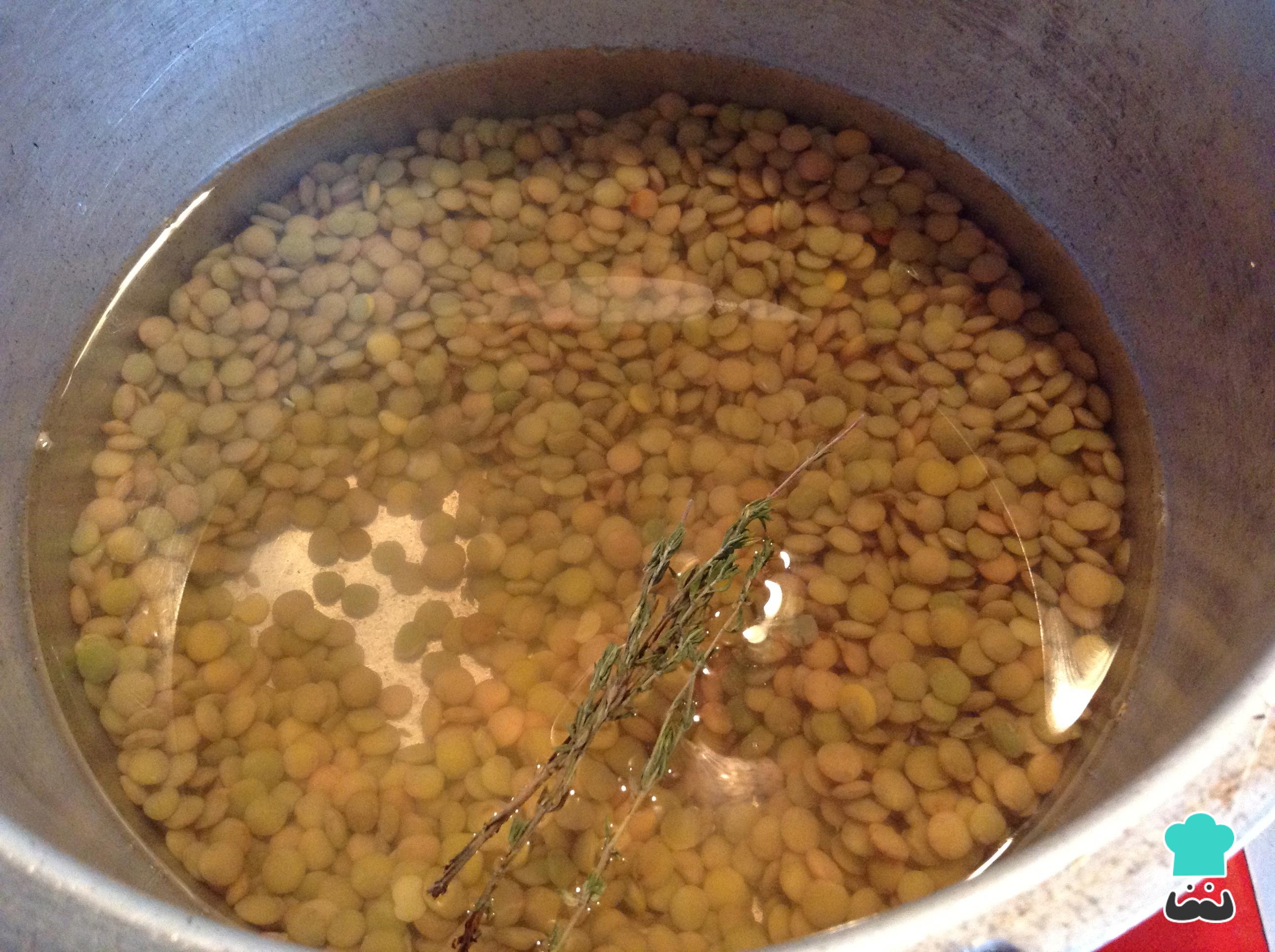 Lleva a una olla a presión las lentejas retirando el agua donde las teníamos hidratadas y adicionando agua nueva que las cubra en su totalidad. Debemos cocinar las lentejas durante 15-20 minutos aproximadamente adicionando las ramas de tomillo para dar un poco de sabor a nuestro puré para bebés.