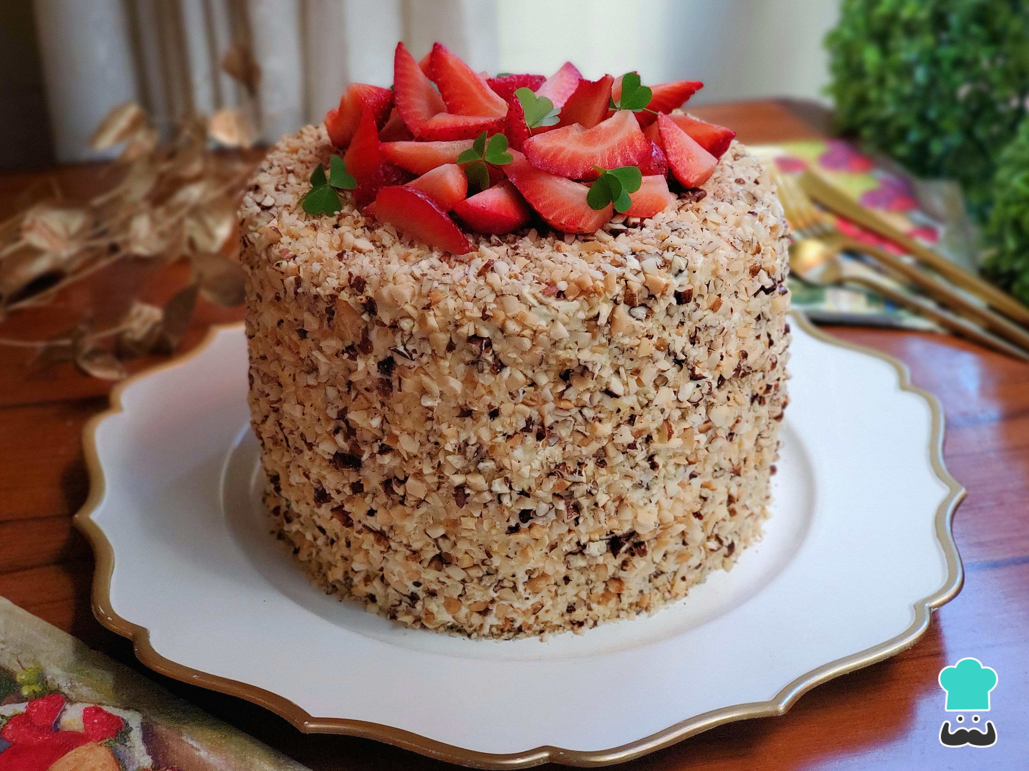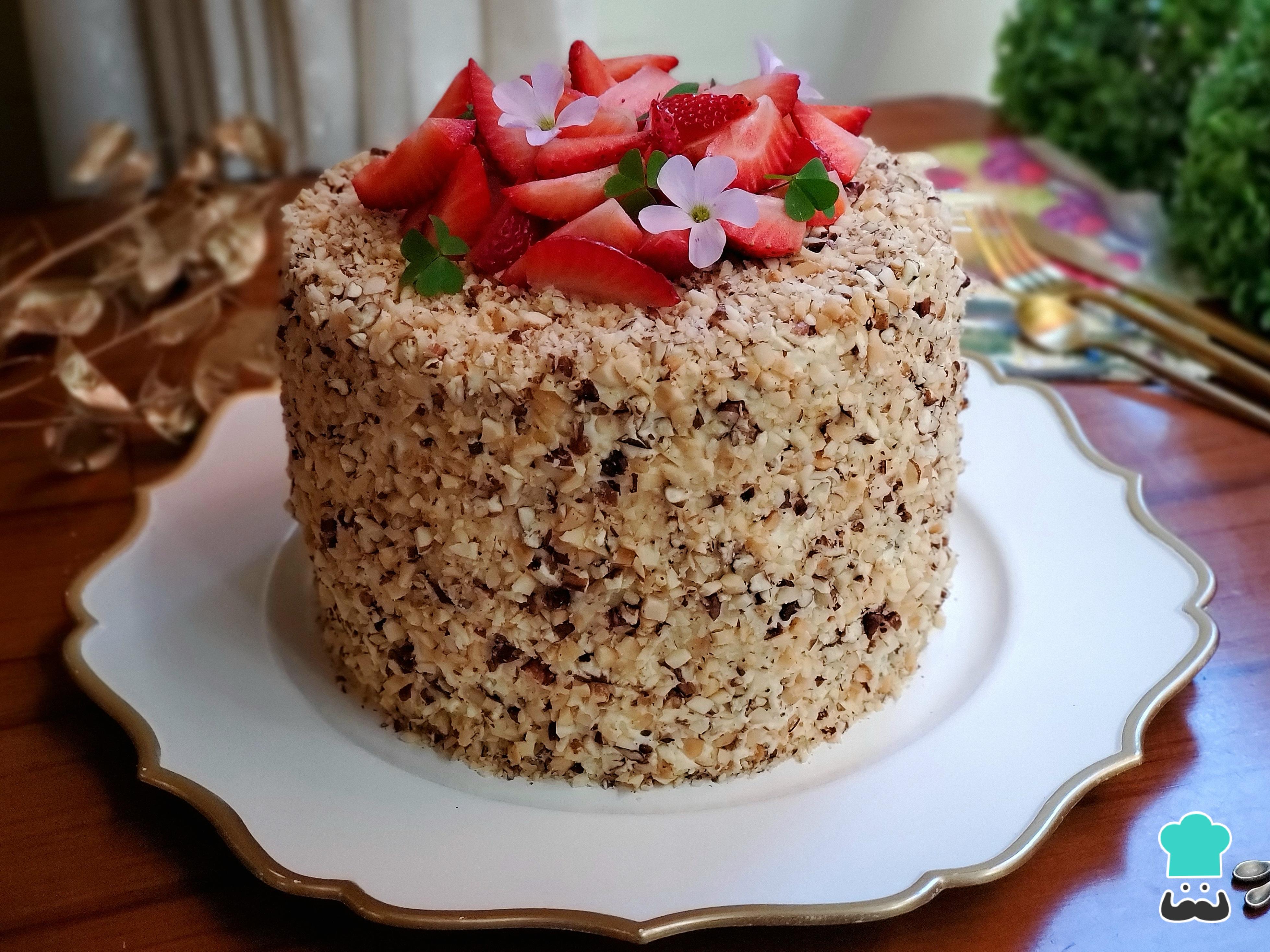 - Rellena y cubre el pastel y termina pegando nueces picadas por todo el borde.