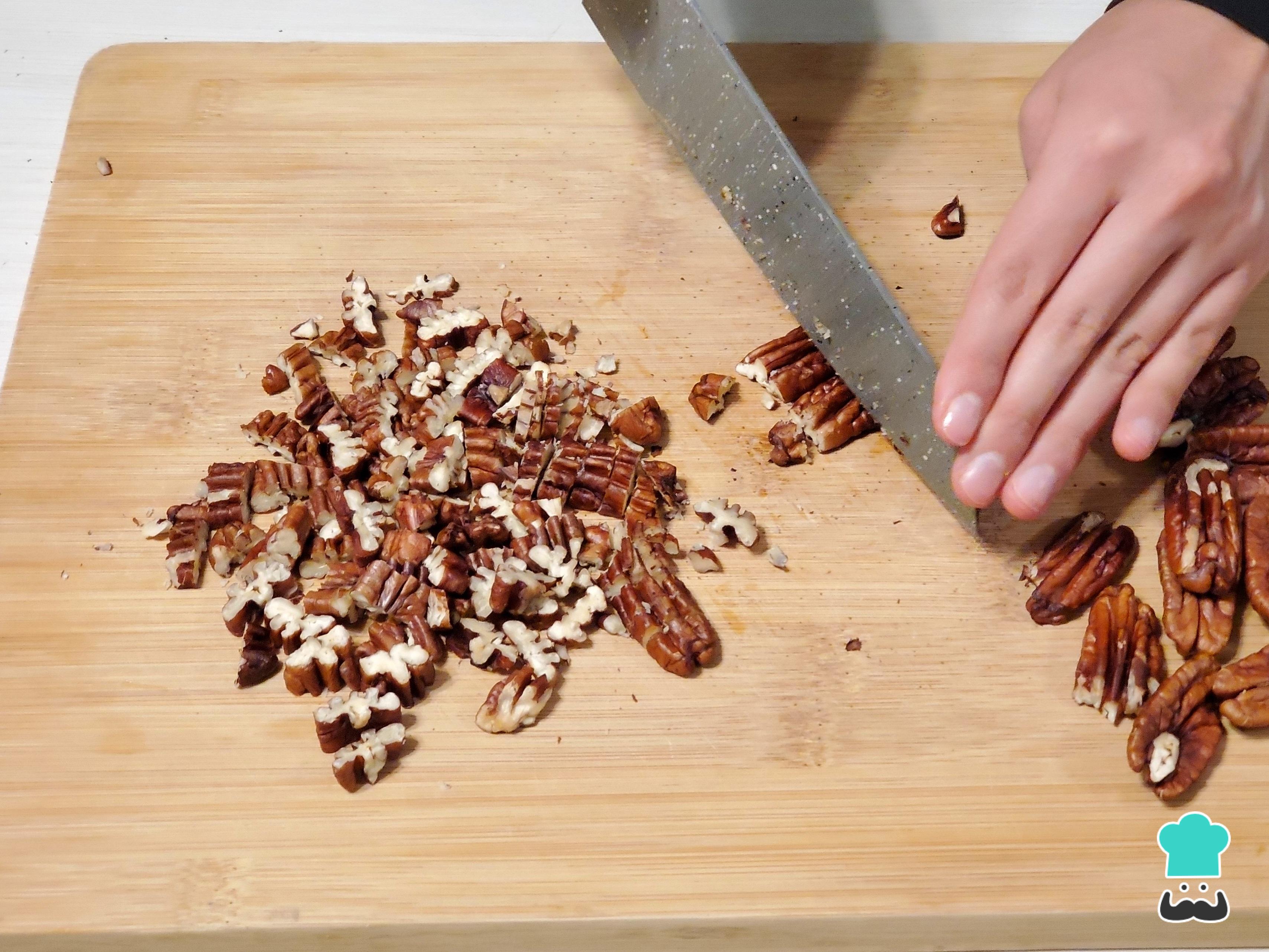 Aparte, pica las nueces de forma rústica si te gusta que el pastel tenga grandes tropezones con esta textura crujiente. Recuerda que deben estar previamente tostadas. Resérvalas en un bowl, vierte un cuarto de la harina y remueve bien.