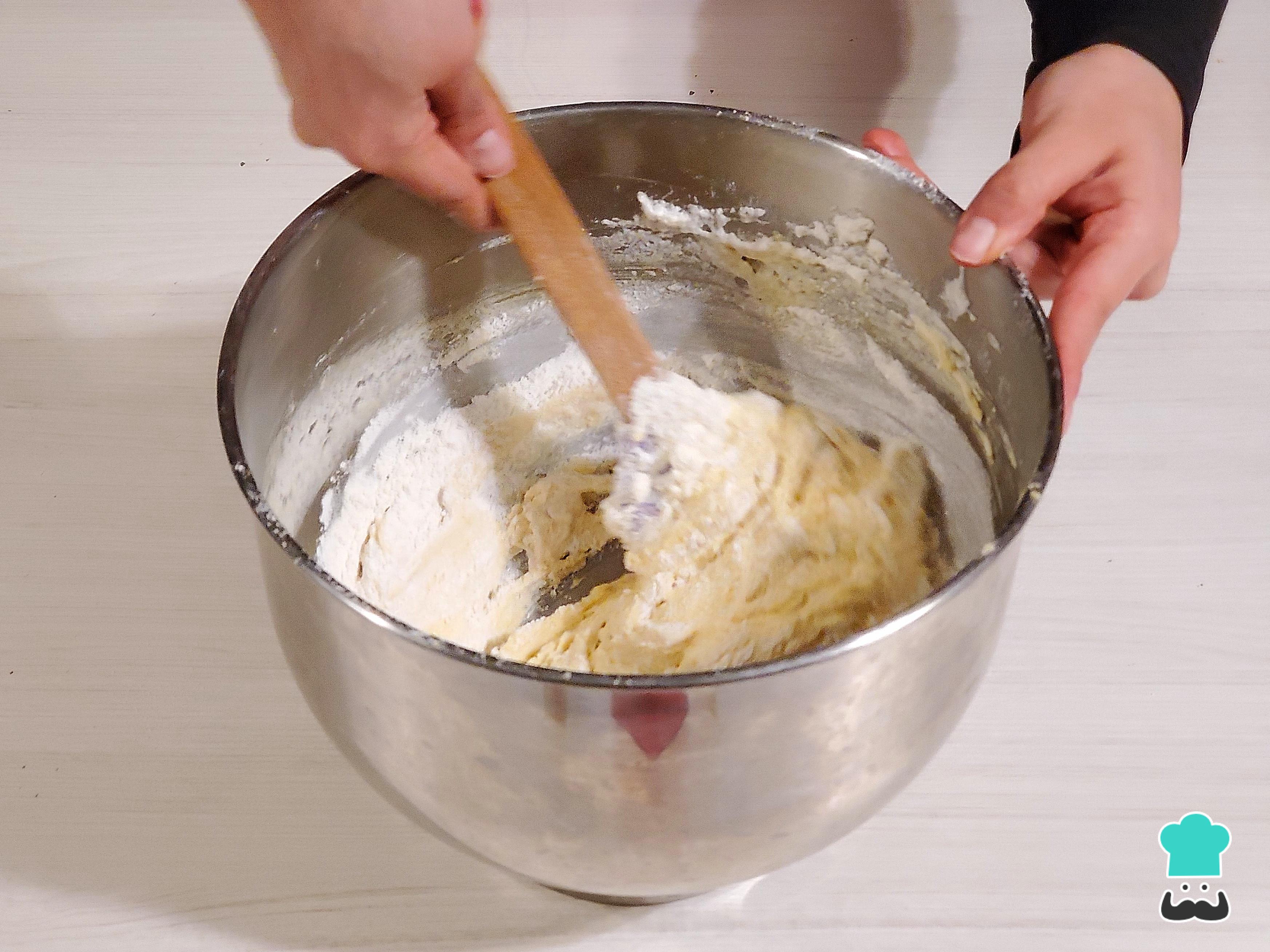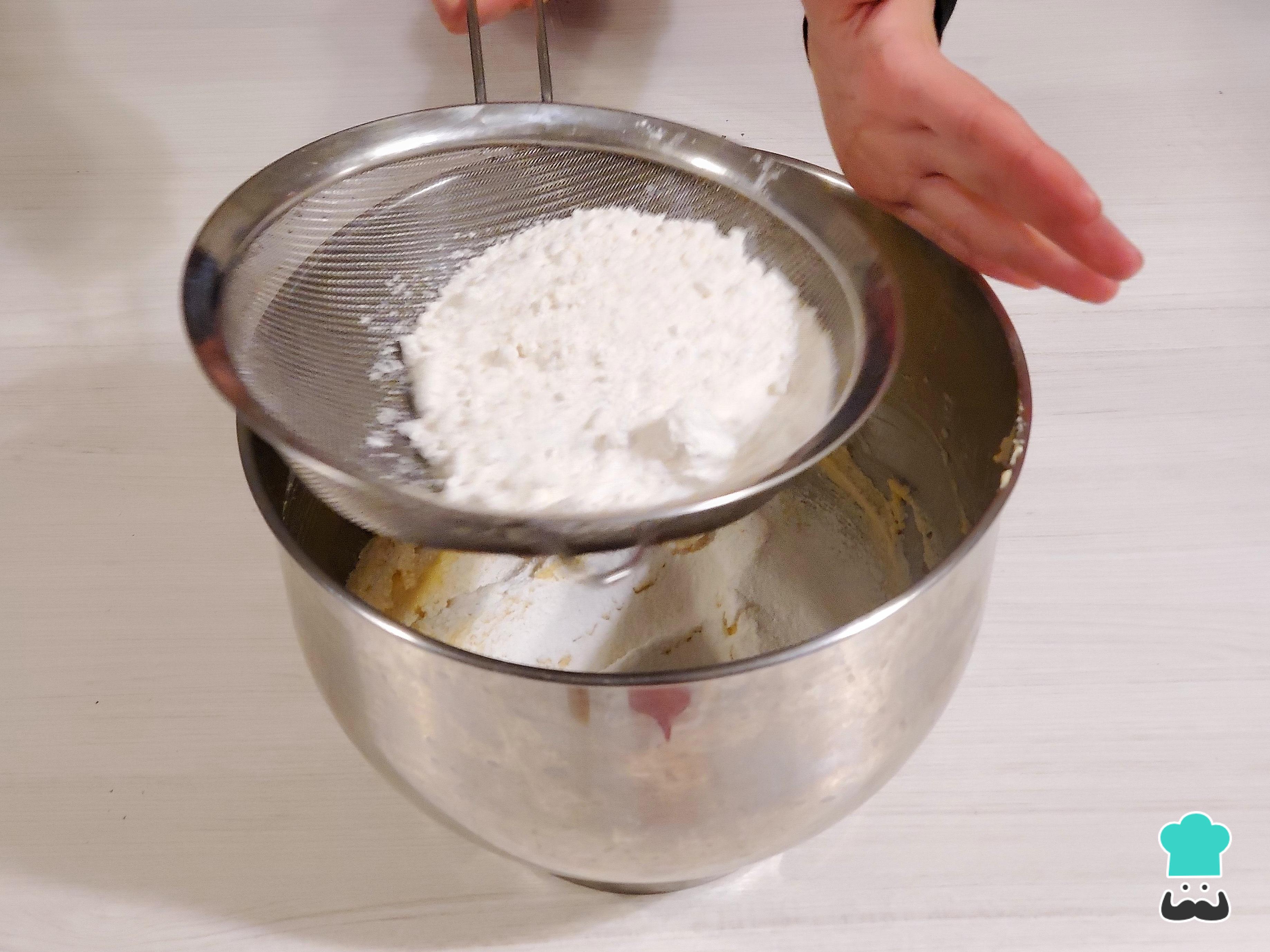 Tamiza los ingredientes secos, que son la harina y el polvo de hornear.