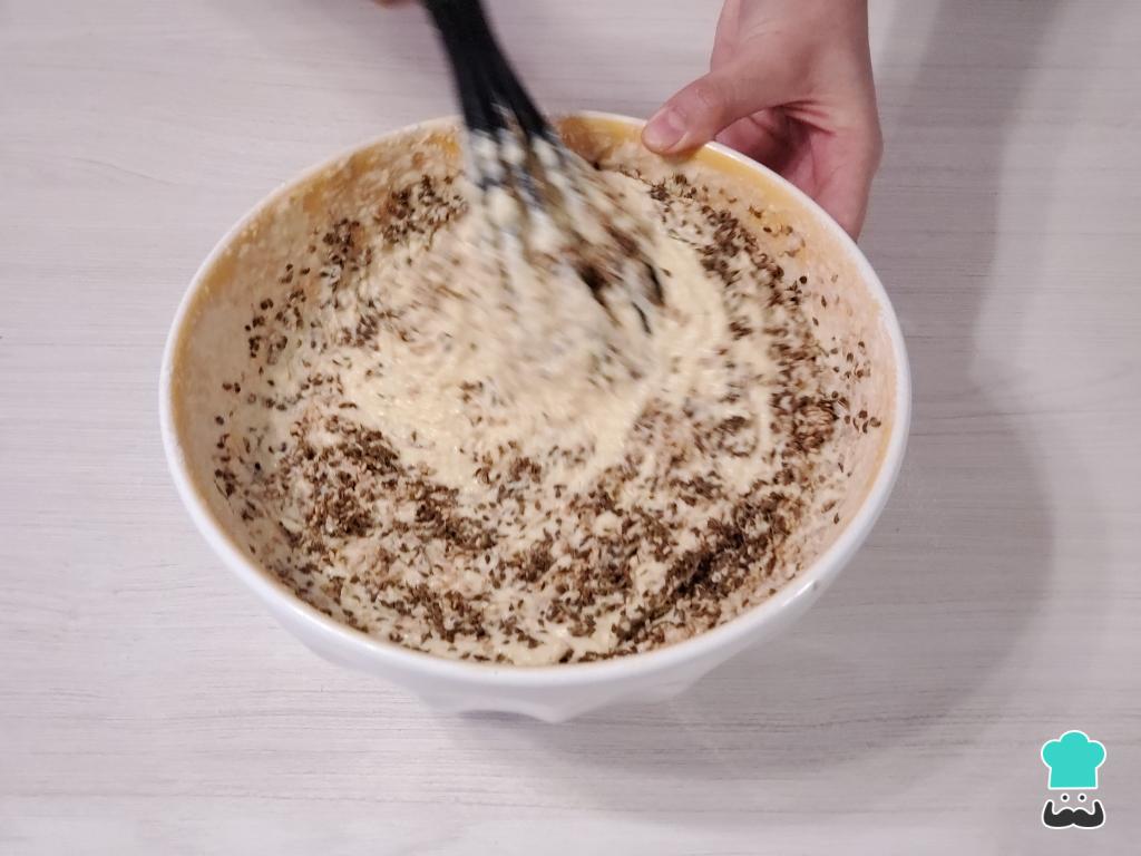 Incorpora las nueces picadas, mezcla utilizando una espátula de goma y vierte esta mezcla en un molde de 18 cm que debe estar previamente enmantequillado y con un disco de papel manteca en la base para facilitar el desmoldado.
